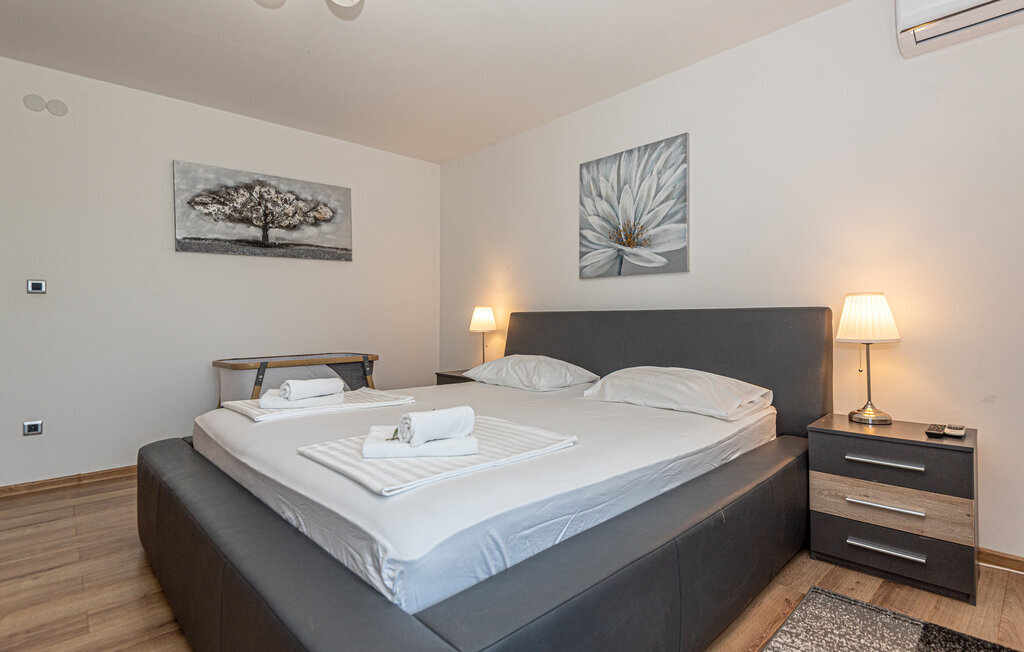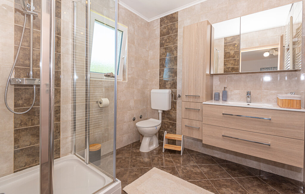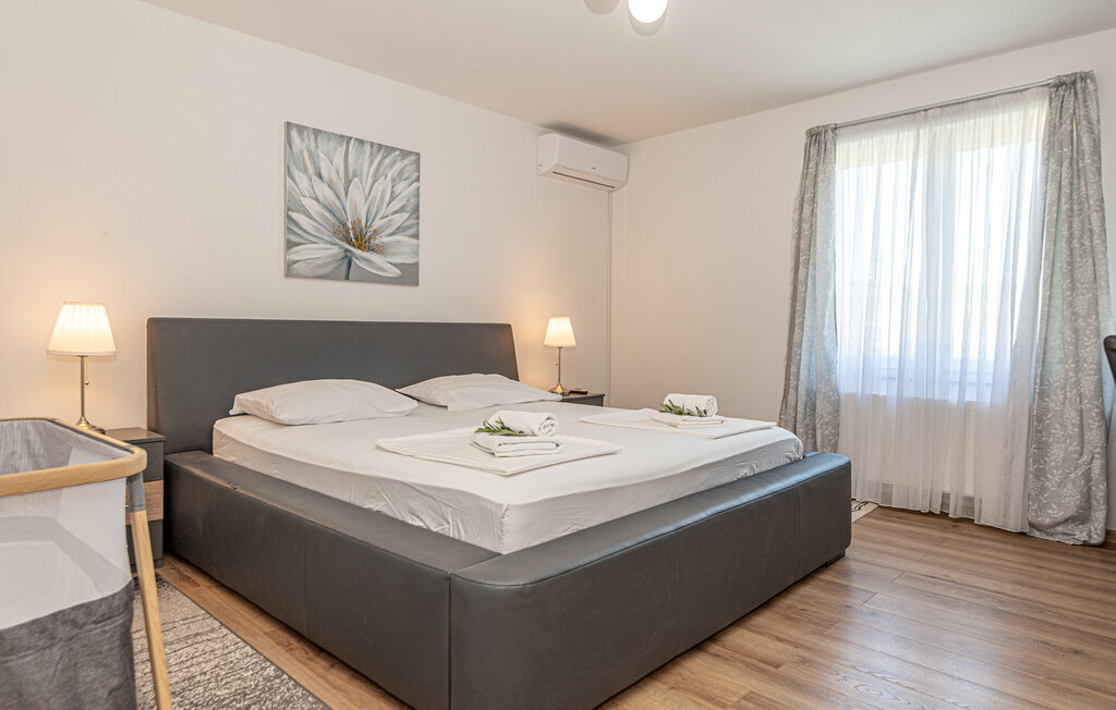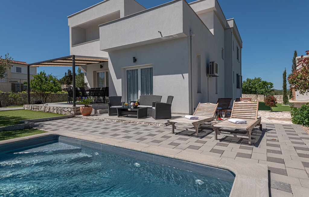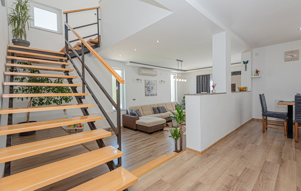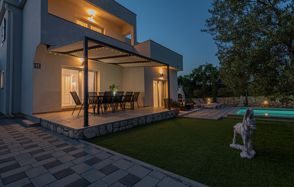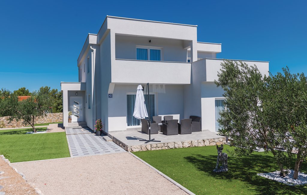 Cette belle maison de vacances avec piscine privée, aménagée avec goût, se trouve dans le village touristique calme de Zaton, près d'ibenik. Elle s'étend sur deux étages reliés par un escalier interne. Quelques marches descendent vers l'espace de vie. La longue plage de sable du village est accessible et donc parfaitement adaptée aux personnes souffrant de handicaps physiques. Une petite forêt de pins jouxte la plage et offre un peu de fraîcheur et d'ombre pendant les chaudes journées d'été. La ville de Zadar, la localité voisine de Nin et les parcs nationaux de Krka, Kornati et Paklenica sont des destinations intéressantes pour les excursions.