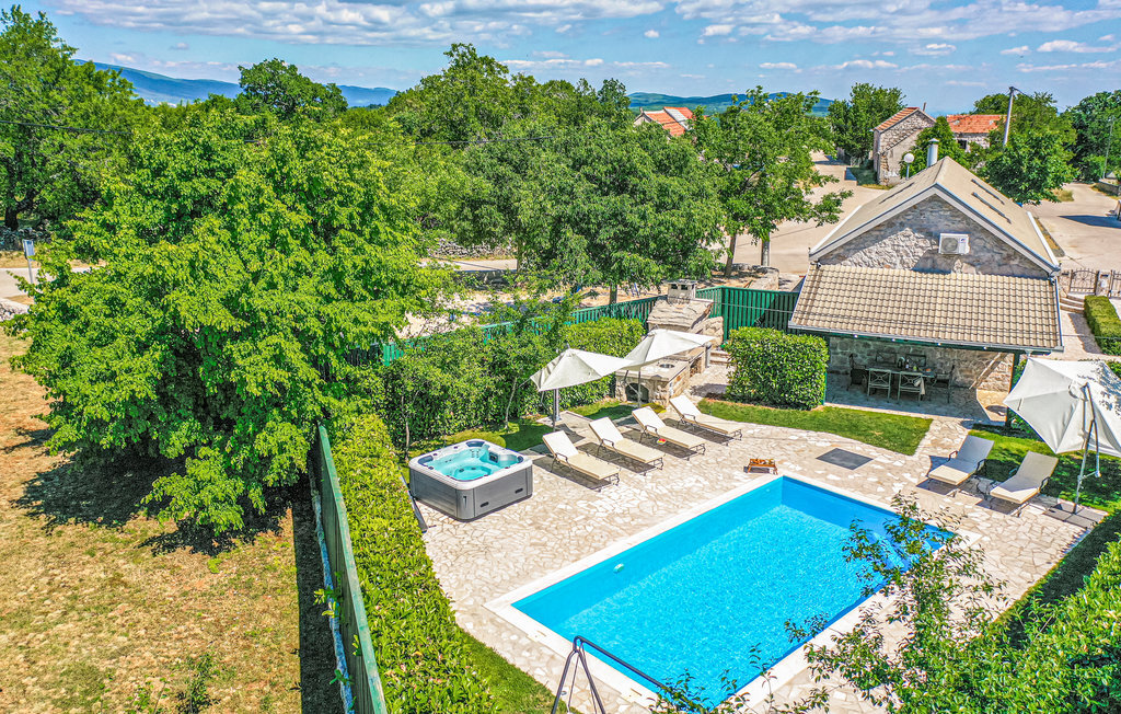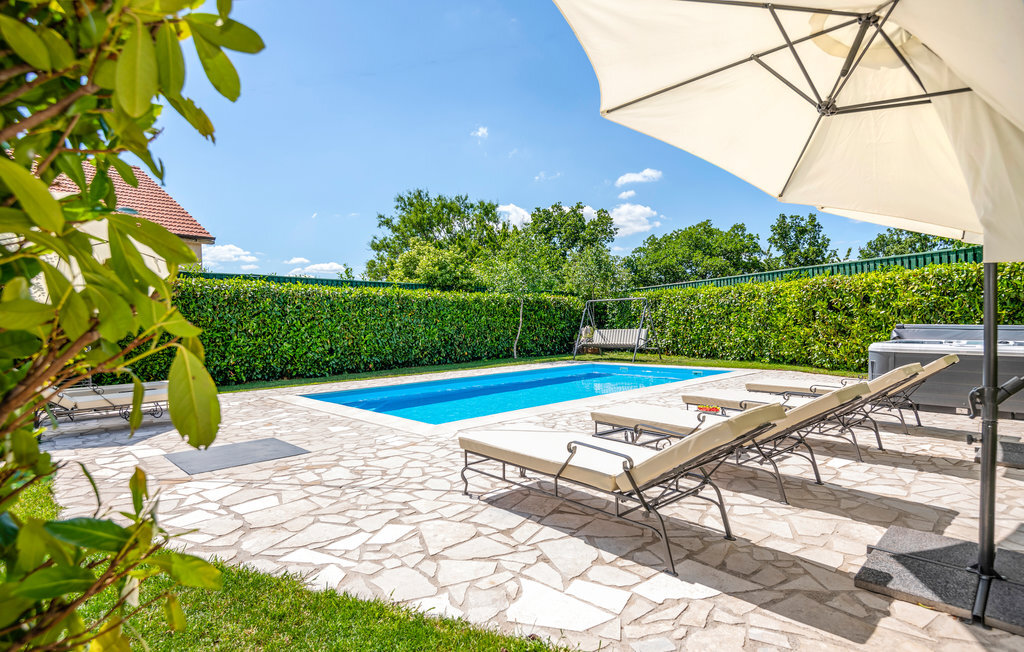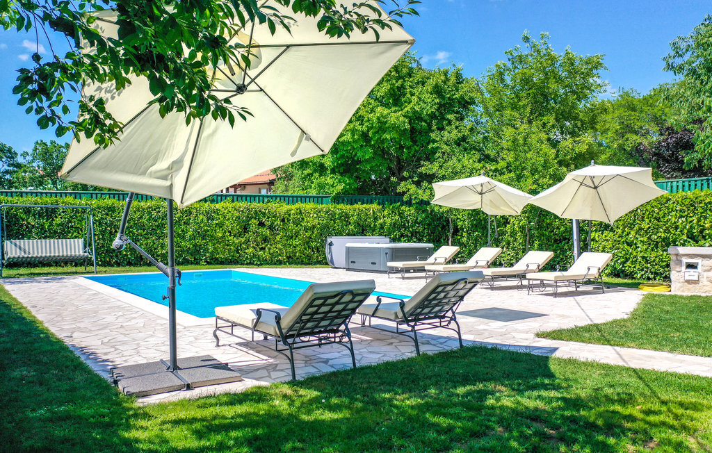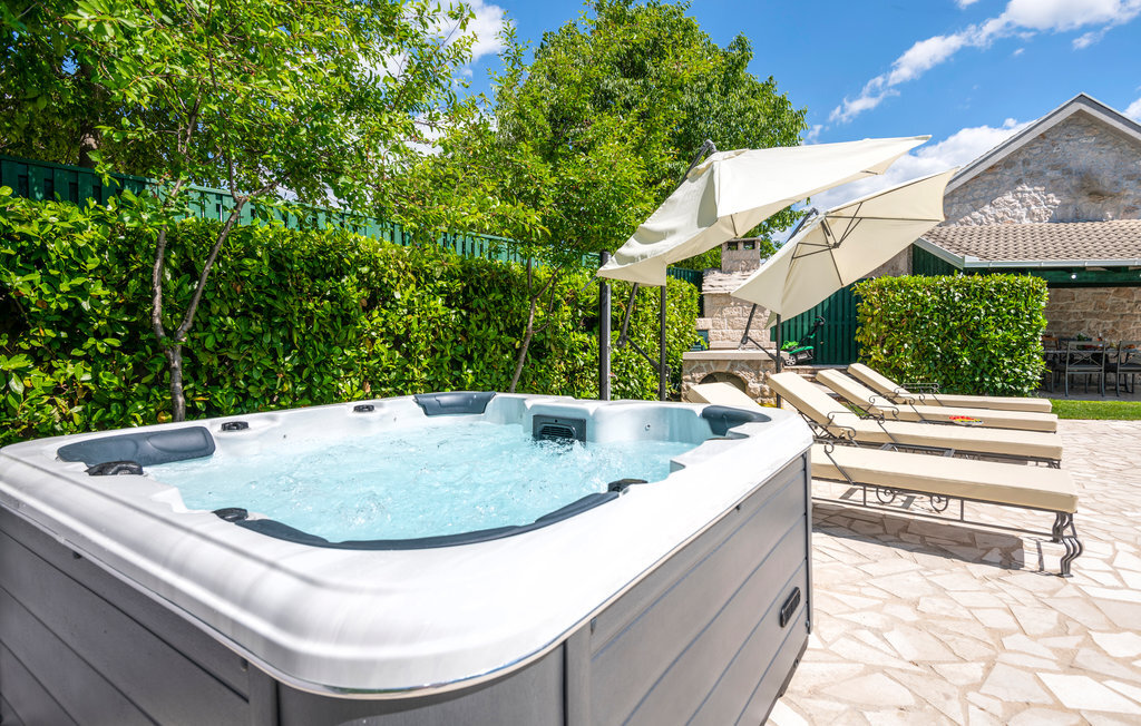 Bien-être à l'extérieur : Location de vacances disposant de chaises-longues et d'un ou plusieurs équipements tels que piscine extérieure, jacuzzi extérieur, lit à baldaquin de jardin etc...