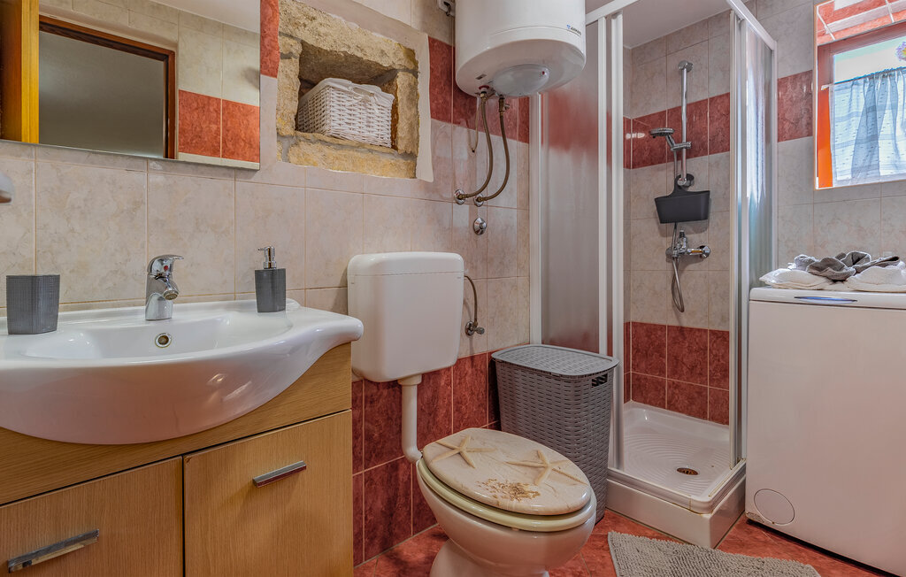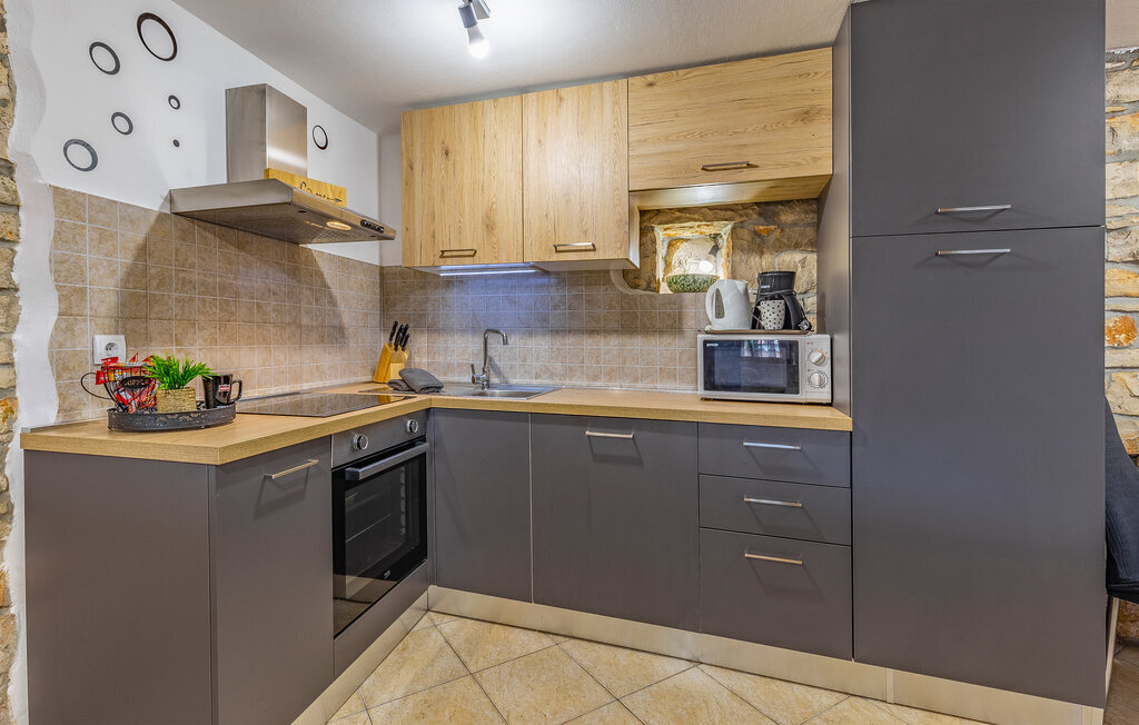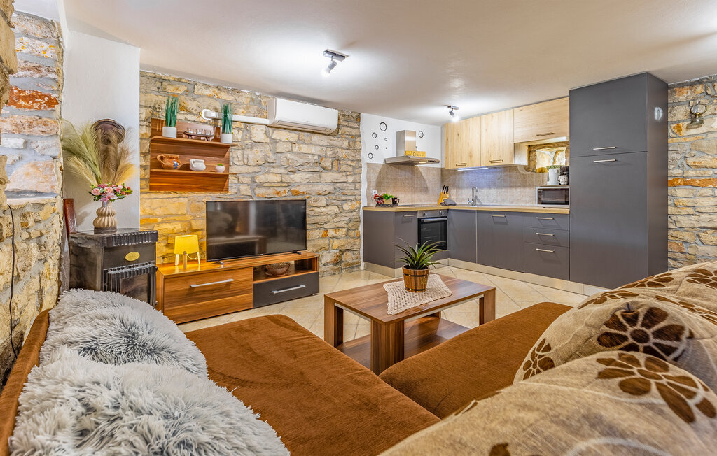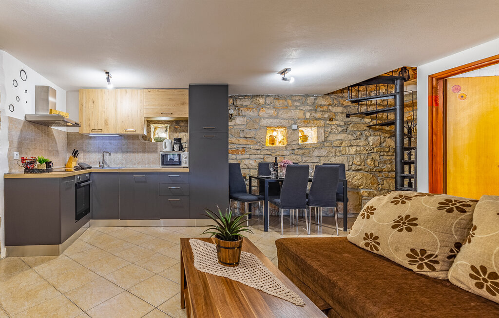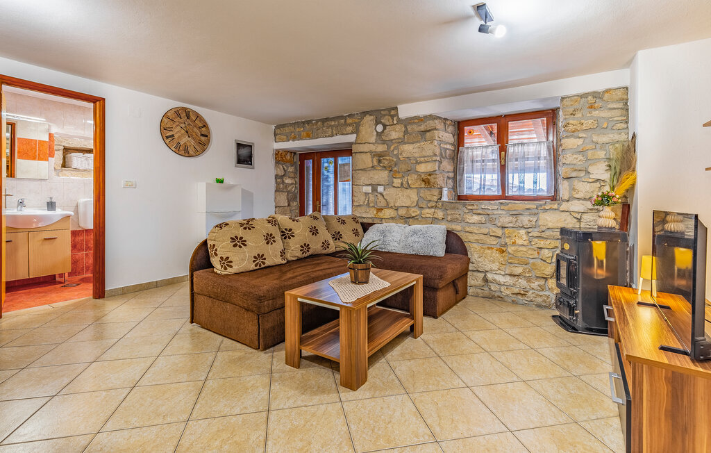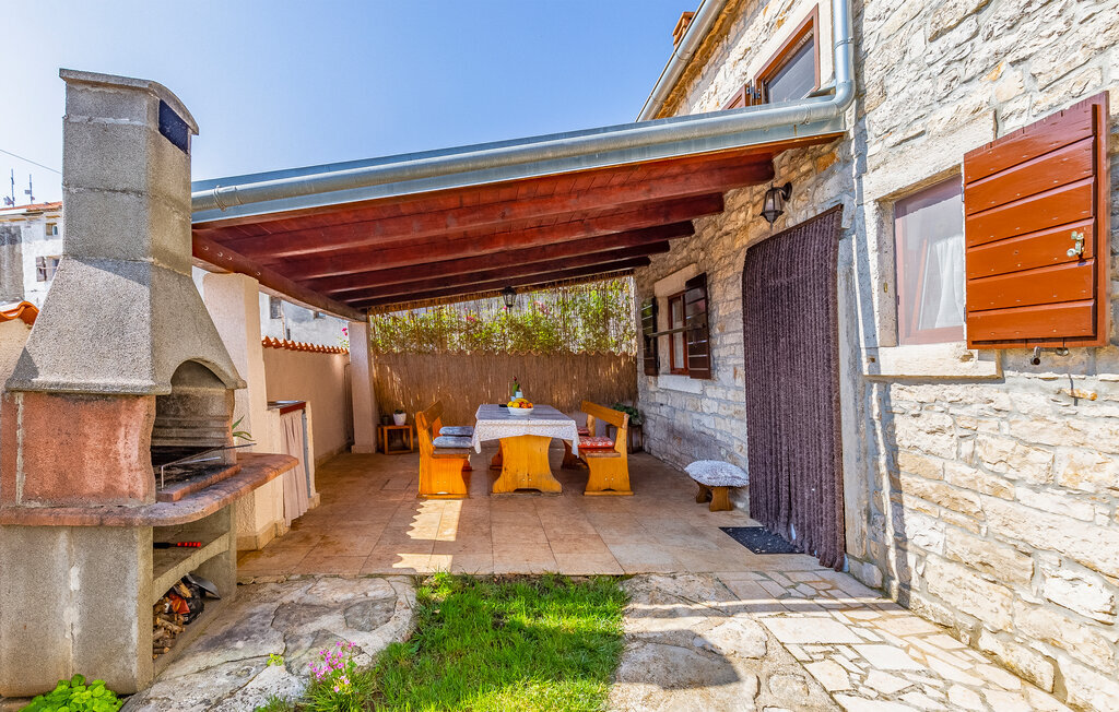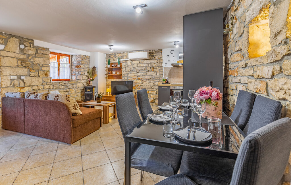 Cette maison jumelée de style Istrien se trouve à Peruki. La maison de vacances a été aménagée avec une grande attention aux détails et s'étend sur deux étages reliés par un escalier en colimaçon. Au rez-de-chaussée se trouve la salle de séjour avec cuisine et salle de bain, tandis qu'au grenier se trouvent deux chambres à coucher. Vous disposez également d'une petite cour entourée de murs et d'une terrasse couverte, où vous vous détendrez certainement pendant que les plus petits joueront sans souci. Le soir, vous gâterez vos proches avec de délicieuses spécialités au barbecue. Découvrez de belles plages de galets et de rochers et explorez la magnifique région. Visitez des villages comme Mutvoran, Krnica et Rakalj avec l'église de Sainte-Agnès et un point de vue attrayant, avec une vue magnifique sur la baie de Raa, Labin et toute la baie de Kvarner.