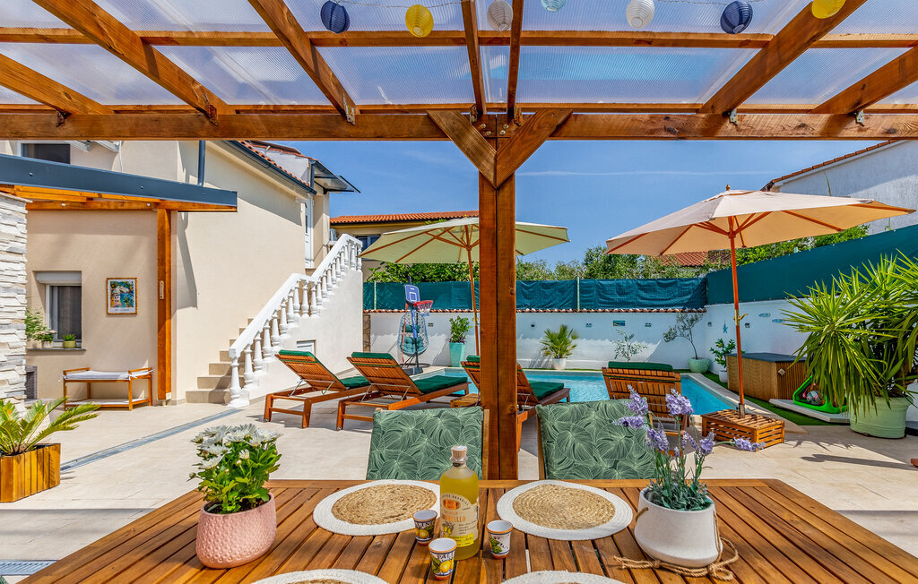 Bien-être à l'extérieur : Location de vacances disposant de chaises-longues et d'un ou plusieurs équipements tels que piscine extérieure, jacuzzi extérieur, lit à baldaquin de jardin etc...