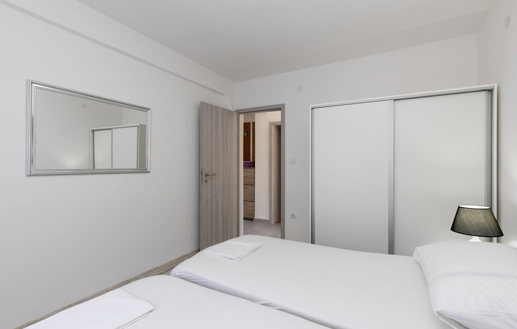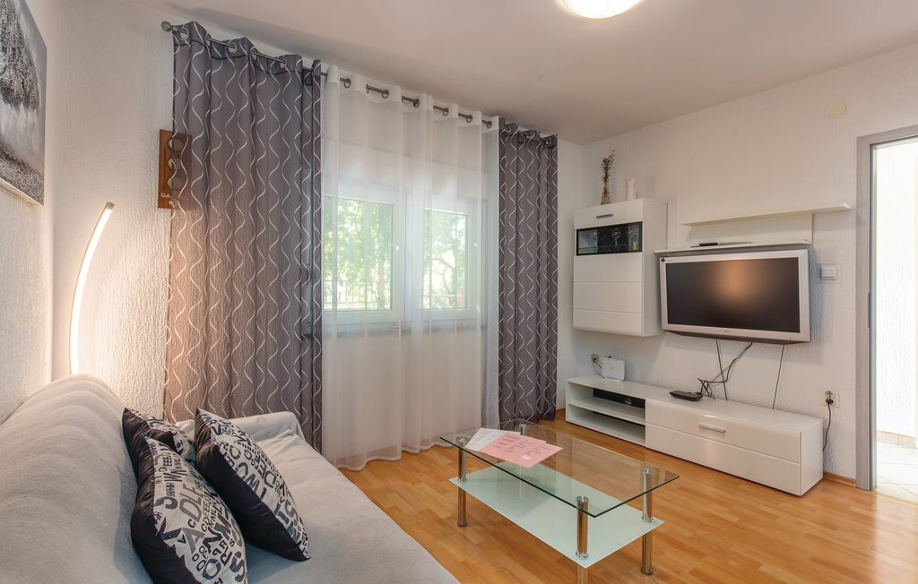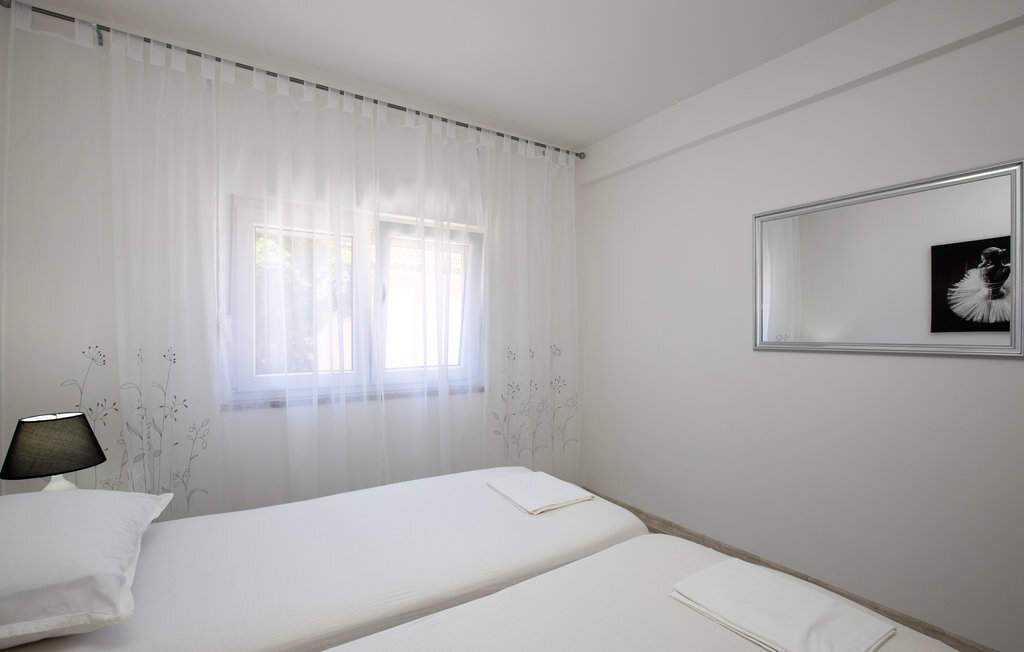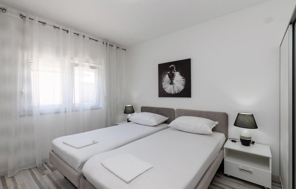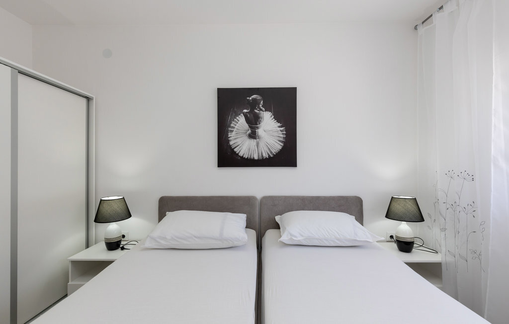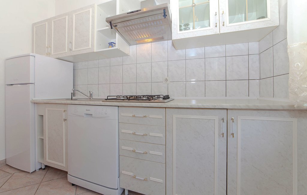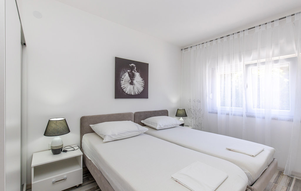 Dans le petit village de Povile, près de la ville, se trouve cette maison de vacances située au calme. Le rez-de-chaussée et le premier étage sont presque identiques dans la répartition des pièces, les étages sont reliés entre eux par un escalier extérieur. Derrière la maison se trouve une grande terrasse ouverte avec barbecue, idéale pour passer des moments ensemble en plein air. La maison est optimale pour deux familles ou un groupe d'amis qui souhaitent passer leurs vacances ensemble. Les plages voisines sont rapidement accessibles à pied. La plage est de galets et non loin se trouve une plage rocheuse avec un plateau en béton.