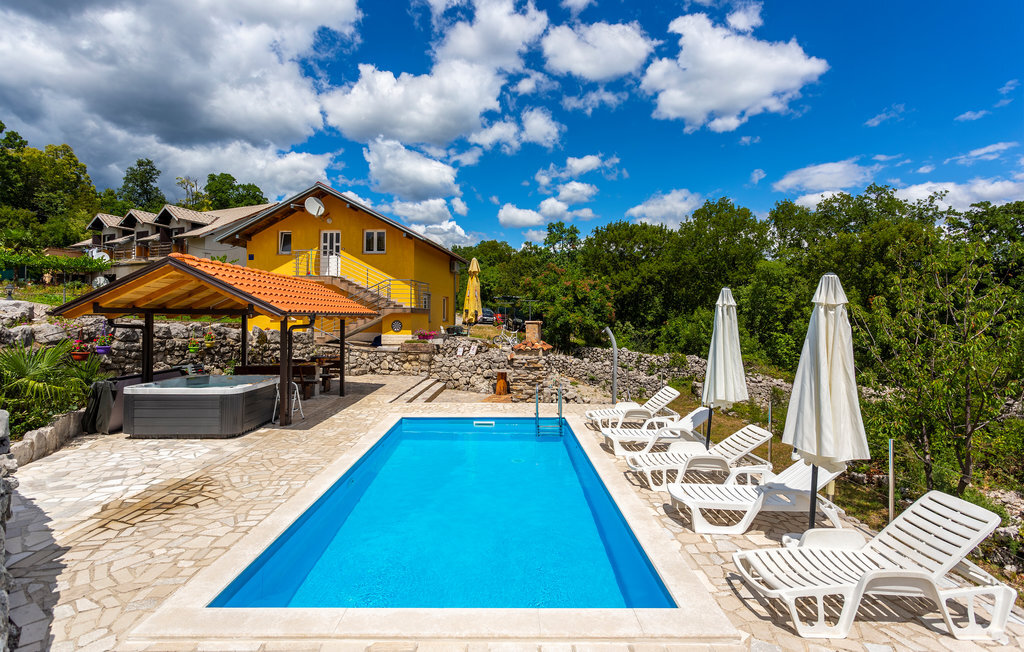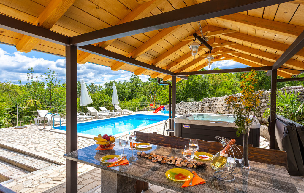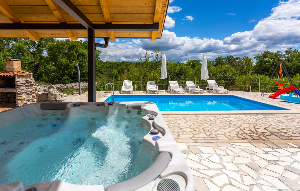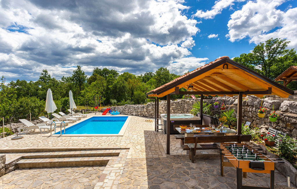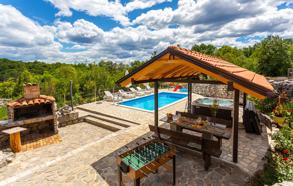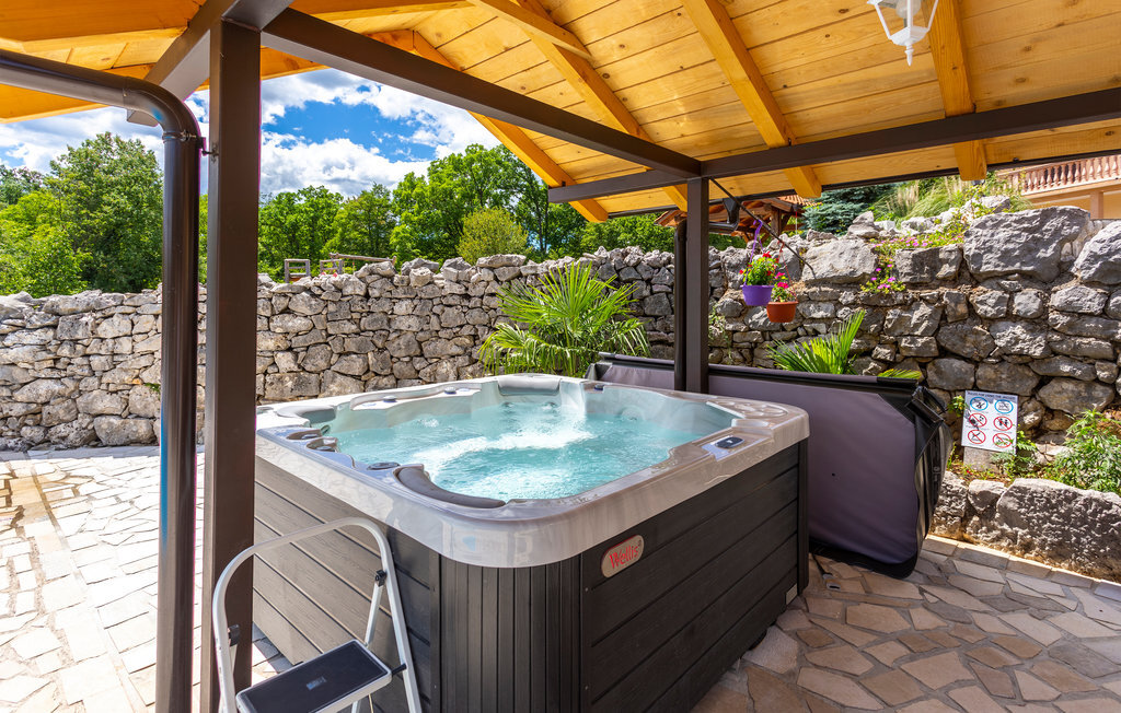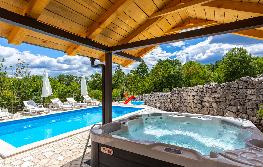Bien-être à l'extérieur : Location de vacances disposant de chaises-longues et d'un ou plusieurs équipements tels que piscine extérieure, jacuzzi extérieur, lit à baldaquin de jardin etc...