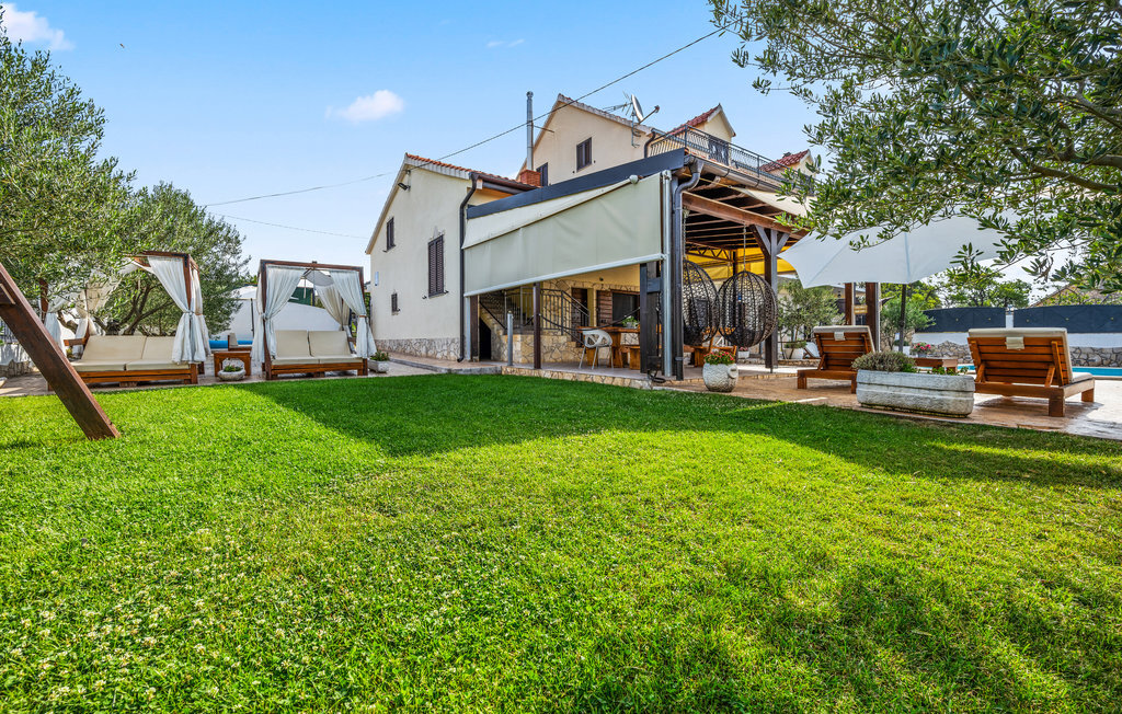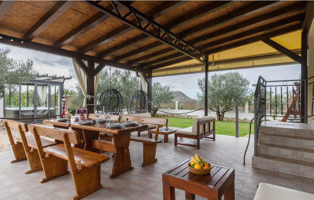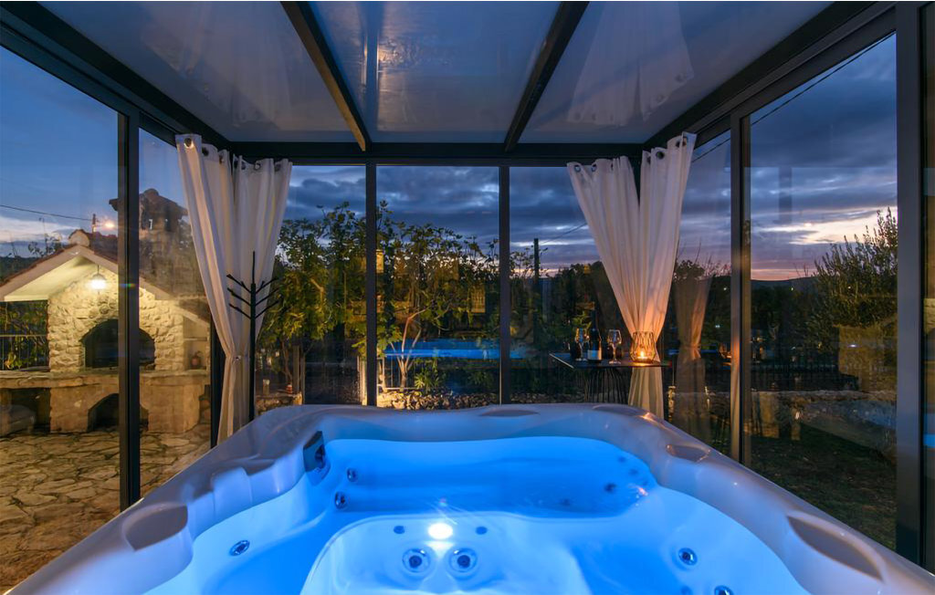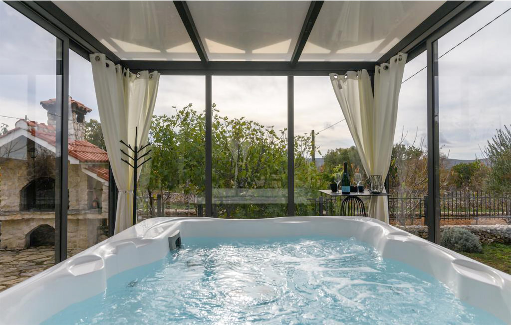 Bien-être à l'extérieur : Location de vacances disposant de chaises-longues et d'un ou plusieurs équipements tels que piscine extérieure, jacuzzi extérieur, lit à baldaquin de jardin etc...