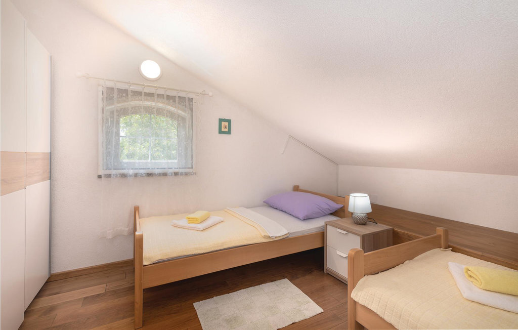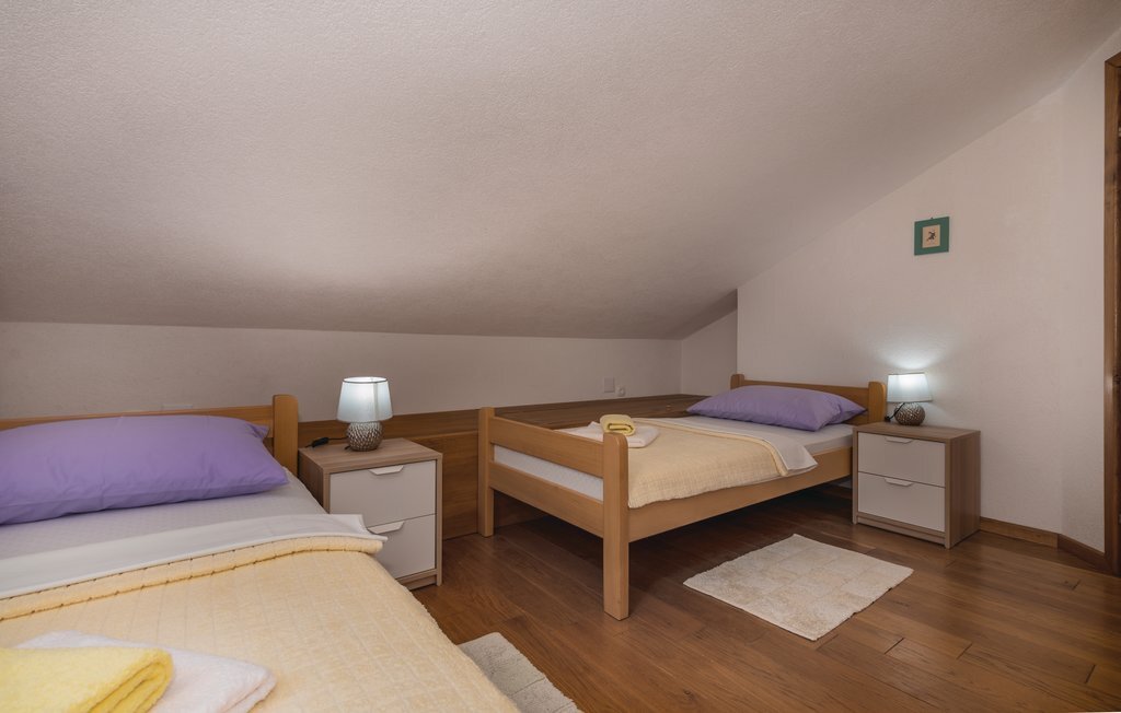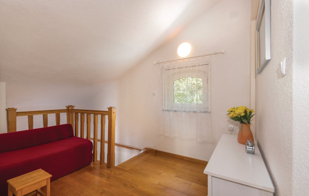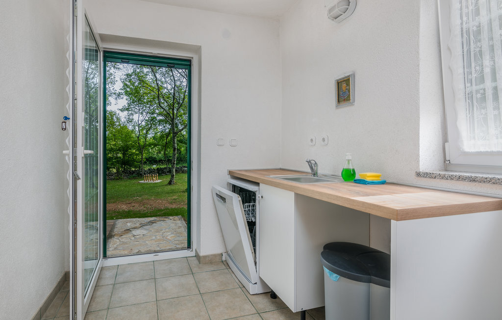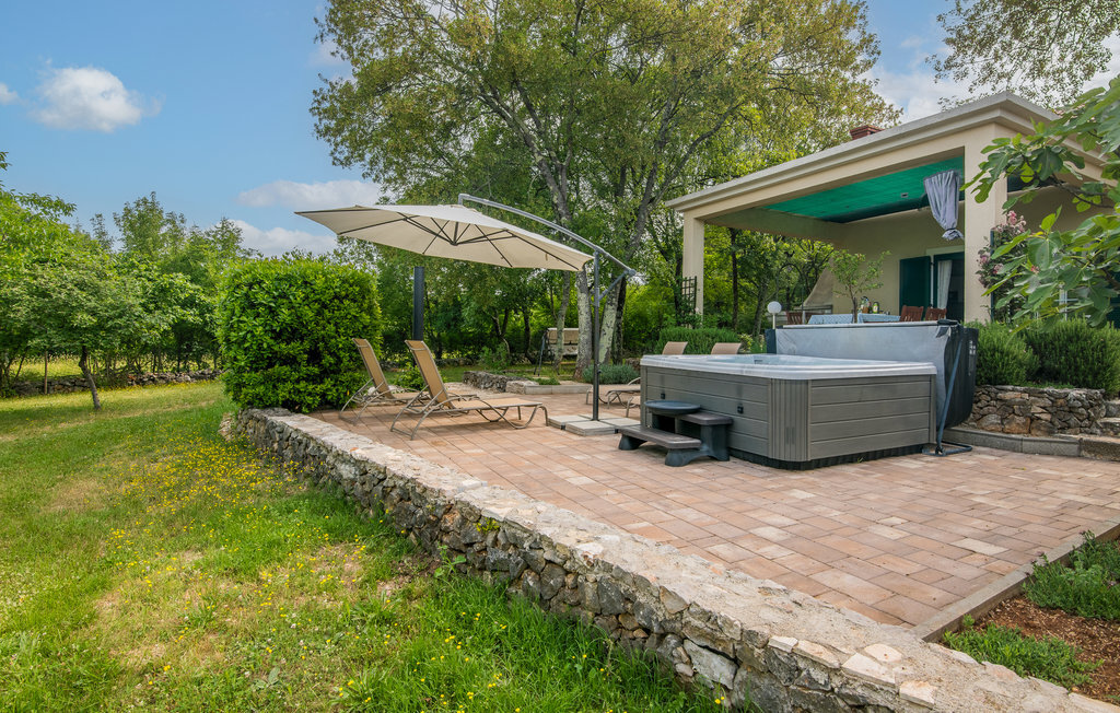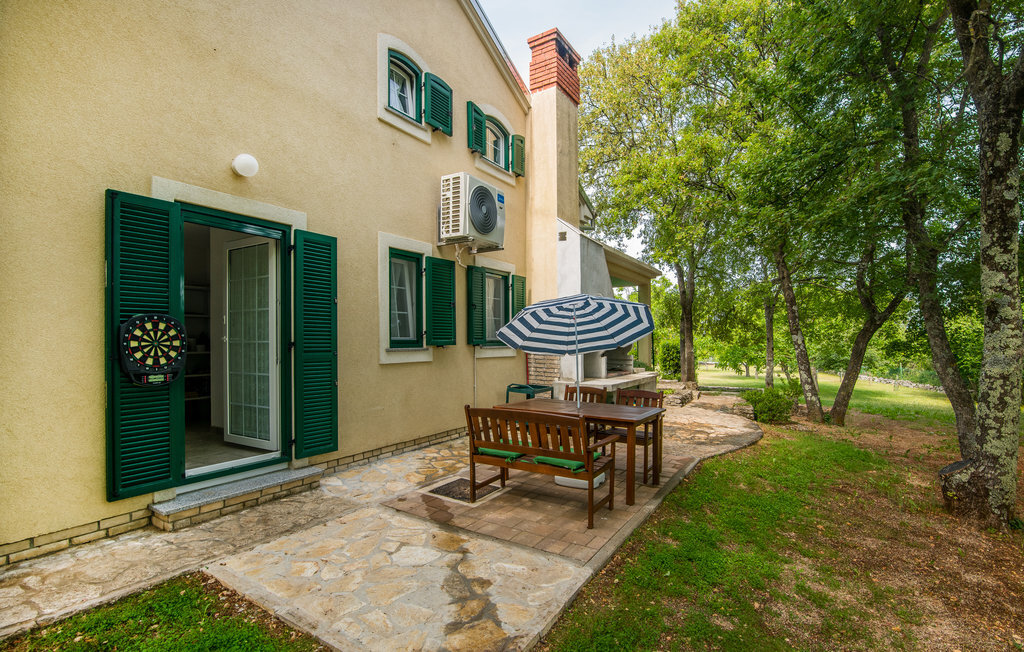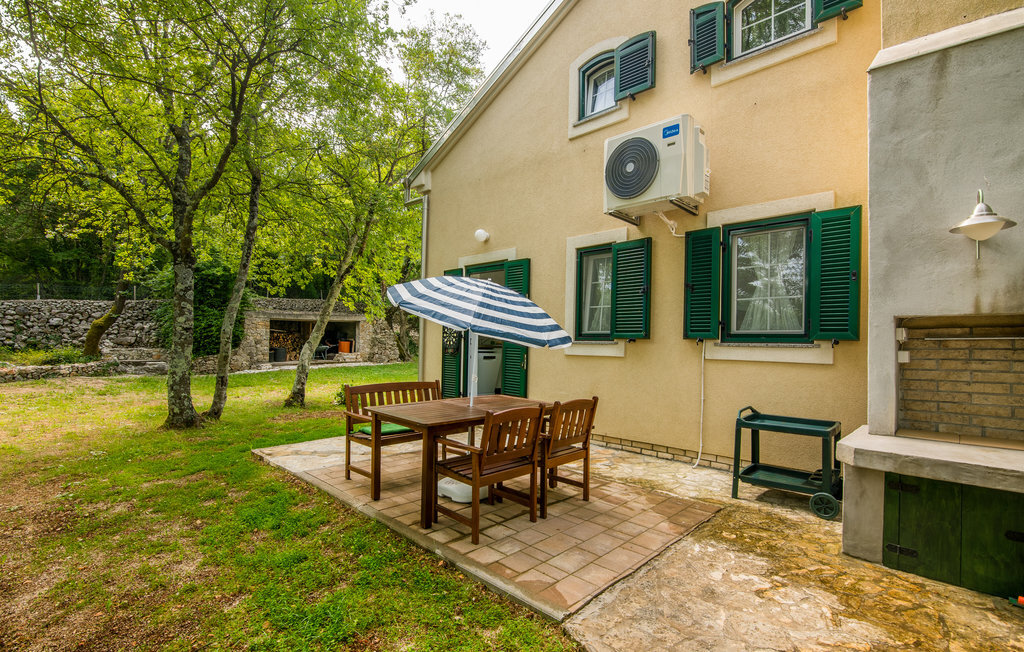 Cette belle maison de vacances se trouve dans le petit village insulaire d'Otrobradi, à proximité de Malinska. Elle se trouve sur un terrain d'environ 3000 m² et est idéale pour les hôtes qui souhaitent se détendre au milieu des oliviers, des arbres fruitiers et de la verdure. Sur le terrain clôturé, vos enfants peuvent jouer sans être dérangés et il y a une balançoire pour nos plus petits hôtes. Au rez-de-chaussée se trouvent le salon, la cuisine et la salle de bain, tandis qu'au premier étage se trouvent la salle de bain, la mini-galerie et deux chambres à coucher avec une hauteur de plafond minimale d'environ 100 cm. Le beau jardin avec terrasse ainsi que le jacuzzi pour 5 personnes, la piste de bowling et les fléchettes ne laissent rien à désirer.