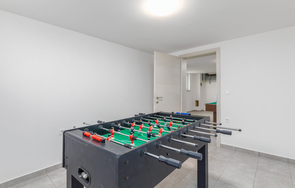 Elle dispose d'un design moderne et d'un intérieur élégamment aménagé. Au rez-de-chaussée se trouvent le salon avec accès aux terrasses, deux salles de bains, une chambre à coucher et une salle de fitness, tandis qu'à l'étage se trouvent six chambres à coucher, quatre salles de bains et un sauna. Cinq chambres ont des terrasses, dont deux donnent sur la piscine et la forêt toute proche, tandis que les autres terrasses donnent sur une magnifique oliveraie. Un billard, une table de ping-pong et un baby-foot sont à disposition. Vous pourrez vous amuser ici, tandis que les enfants pourront s'amuser sur le trampoline et les balançoires. Pendant votre séjour, vous vous amuserez certainement à prendre des bains de soleil et à nager dans la grande piscine, tout en dégustant vos grillades préférées.