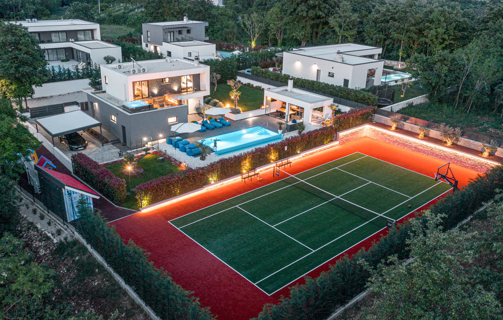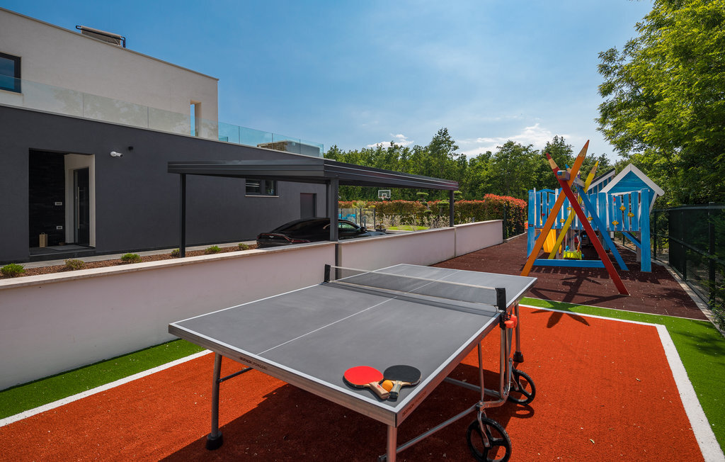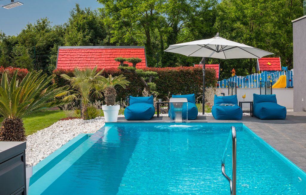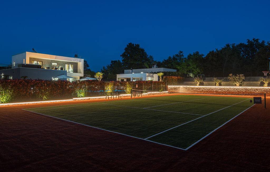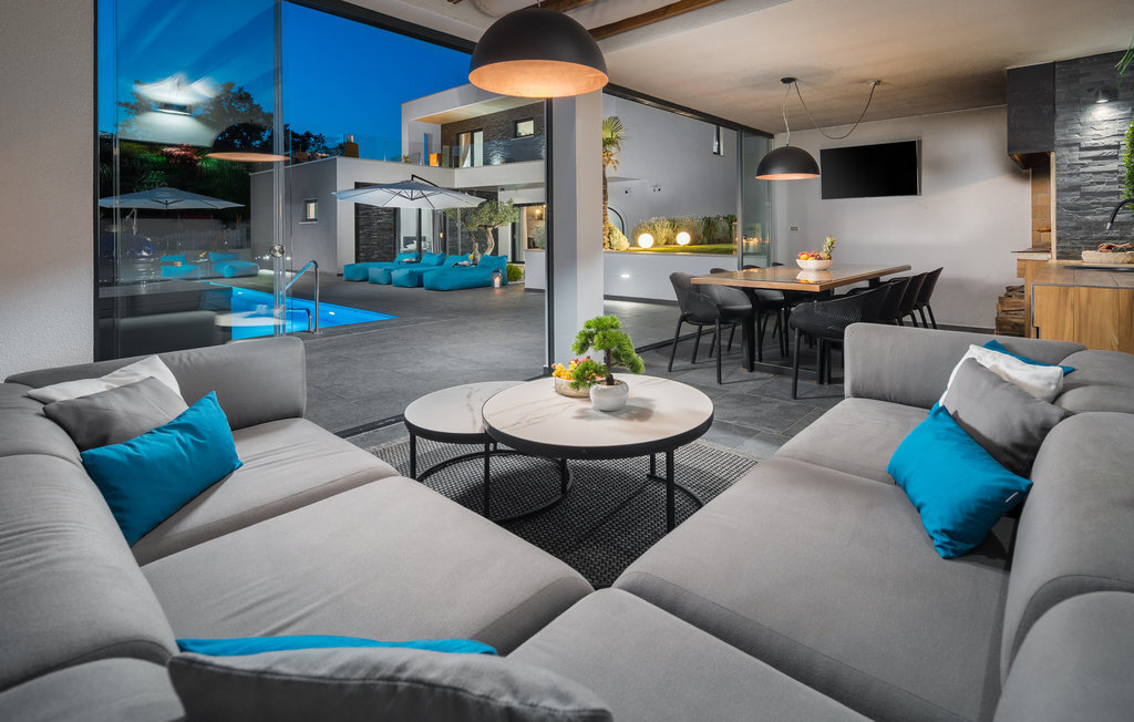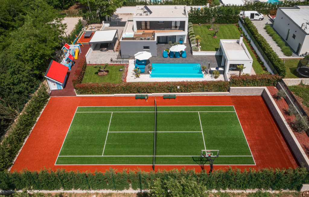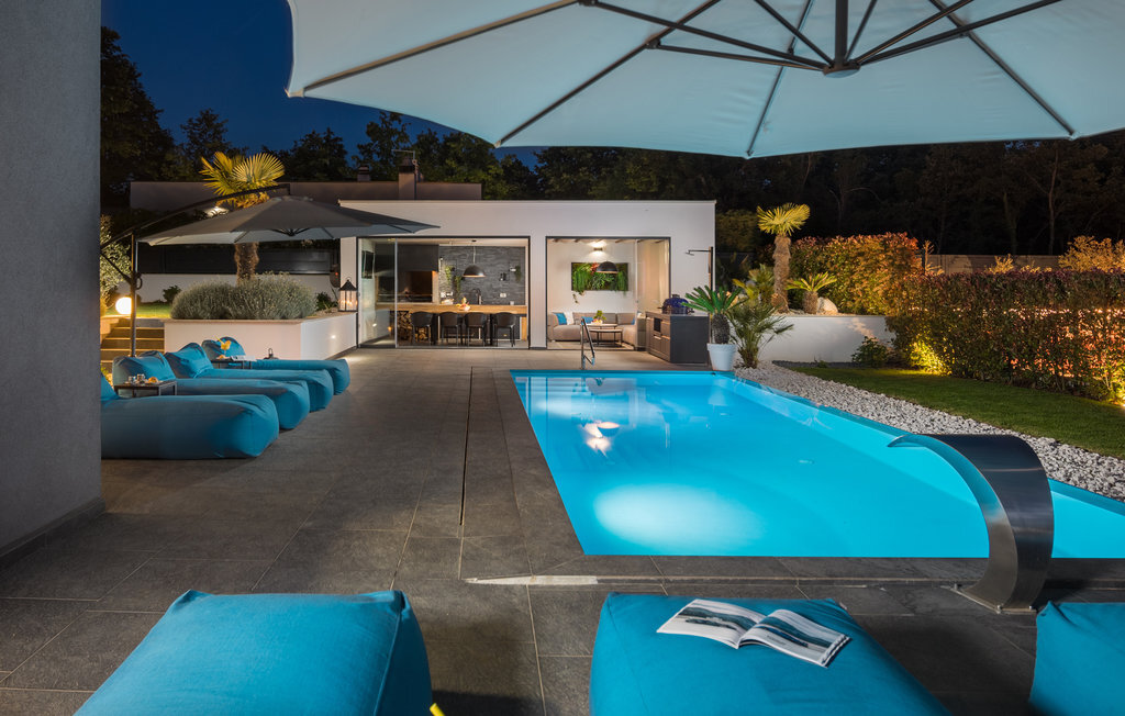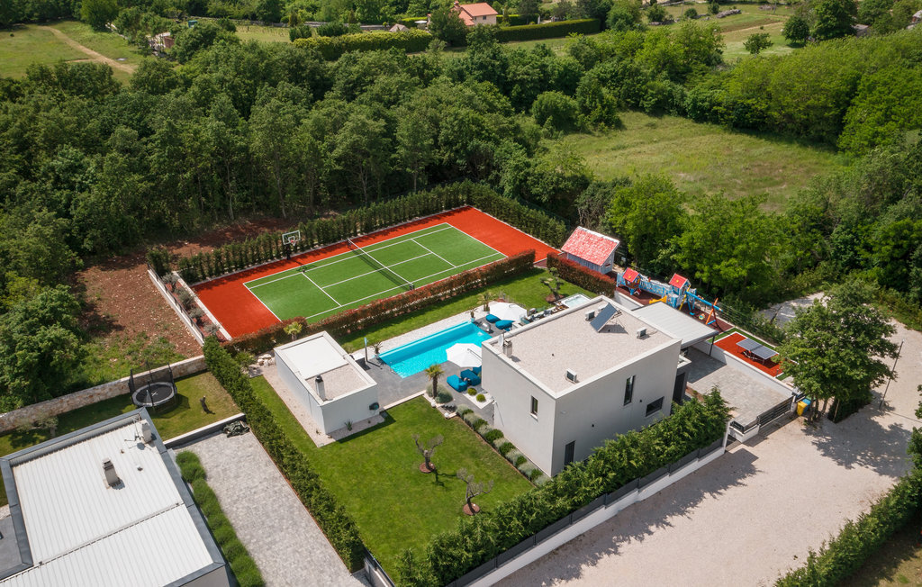 Cette impressionnante villa à l'architecture et au design modernes offre un confort maximal à ses hôtes. Cette belle villa n'est pas seulement agréable à l'œil, elle séduit également par sa qualité et sa fonctionnalité. Elle est située à l'intérieur de l'Istrie, entourée de verdure, sur un terrain clôturé d'environ 1000 m², qui offre beaucoup de calme et d'intimité. L'intérieur s'étend sur le rez-de-chaussée et le premier étage. Les espaces ouverts se composent d'un grand salon avec cheminée ainsi que d'une cuisine et d'une salle à manger, tandis que chaque chambre dispose de sa propre salle de bain avec climatisation et télévision. D'immenses baies vitrées inondent les pièces de lumière et donnent directement accès aux terrasses orientées vers le jardin et la piscine. Dans le jardin, une piscine rafraîchissante avec une zone de bronzage et une cuisine extérieure, à côté de laquelle se trouve un salon confortable, vous attendent. Les petits hôtes ne s'ennuieront pas non plus dans cette maison de rêve, car de nombreuses installations de jeux leur permettront de s'amuser.