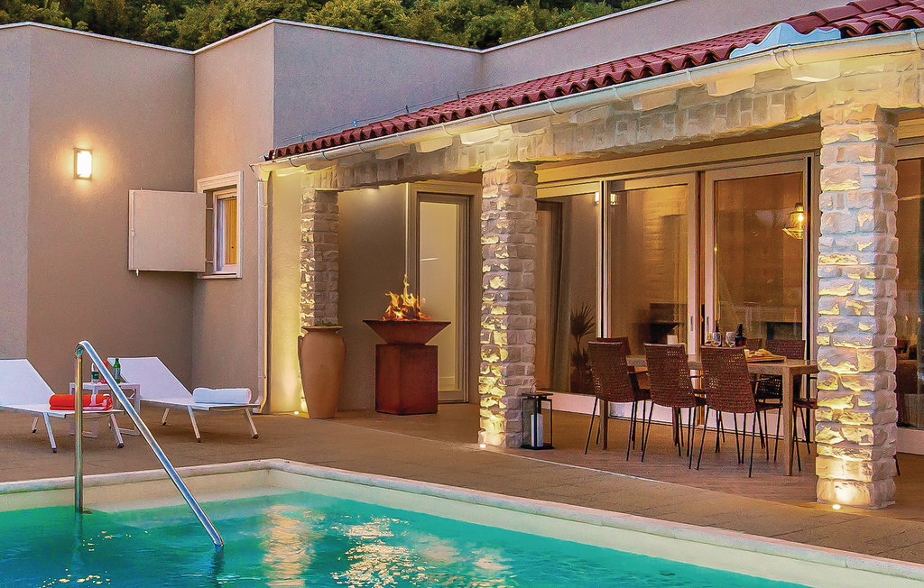 Dans ce complexe de villas modernes, spacieuses et bien équipées avec piscines privées à Veprinac, cette villa spacieuse avec une vue magnifique sur la mer a également sa place. Le grand aménagement intérieur comprend un espace de vie avec un salon spacieux, une salle à manger et une cuisine. De là, vous accédez au jardin avec une piscine et une terrasse couverte. Pour votre divertissement, il y a également une salle de spectacle, un espace fitness, un sauna et une cave à vin. Les villas sont situées juste à côté du massif montagneux d'Uka et de son parc naturel, offrant ainsi la possibilité de passer des vacances actives. Les belles plages de la Riviera d'Opatija sont à une dizaine de kilomètres et d'autres installations et petites villes touristiques le long de la côte vous enchanteront par sa beauté et sa gastronomie.