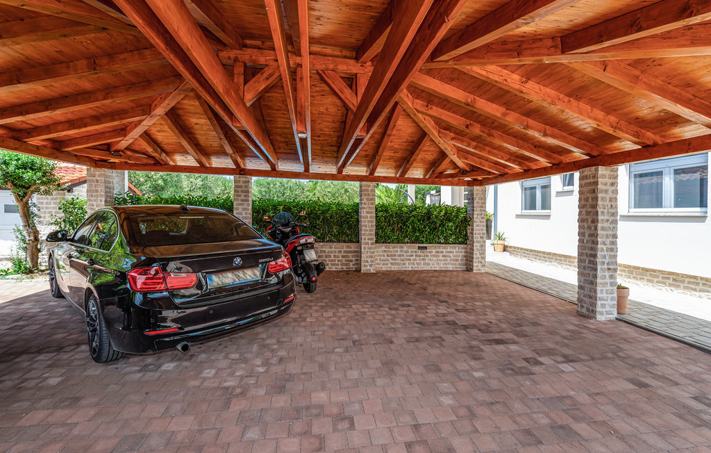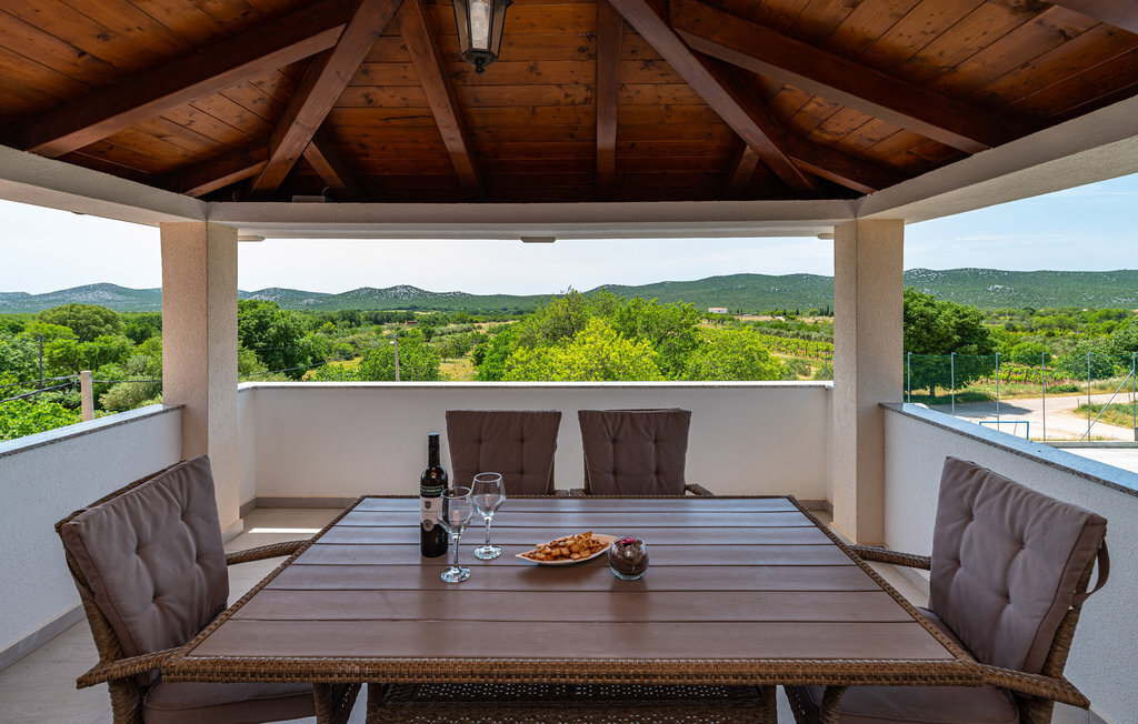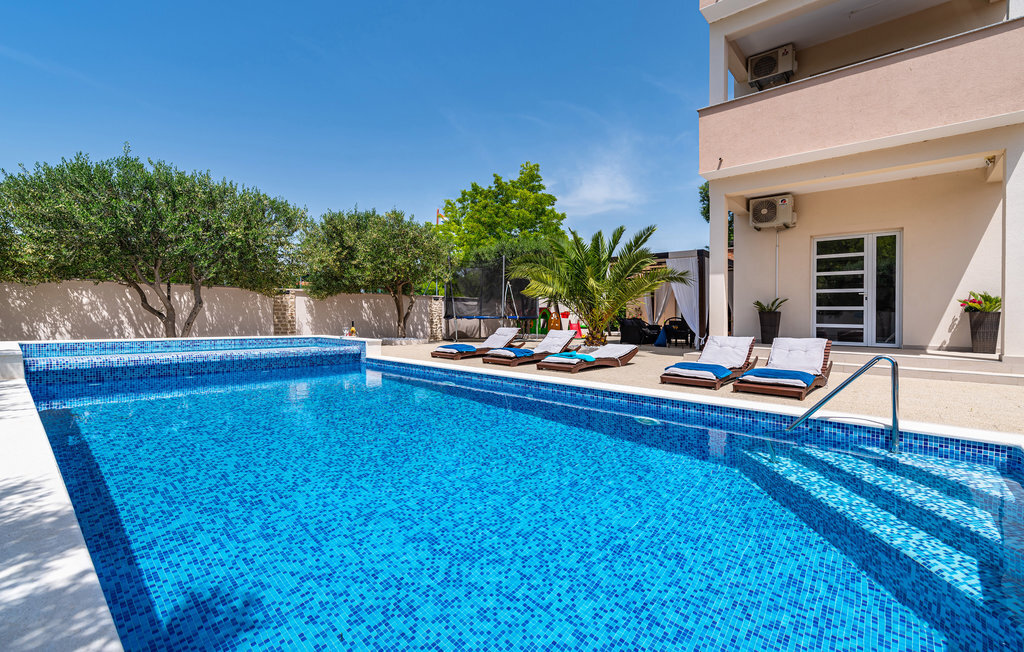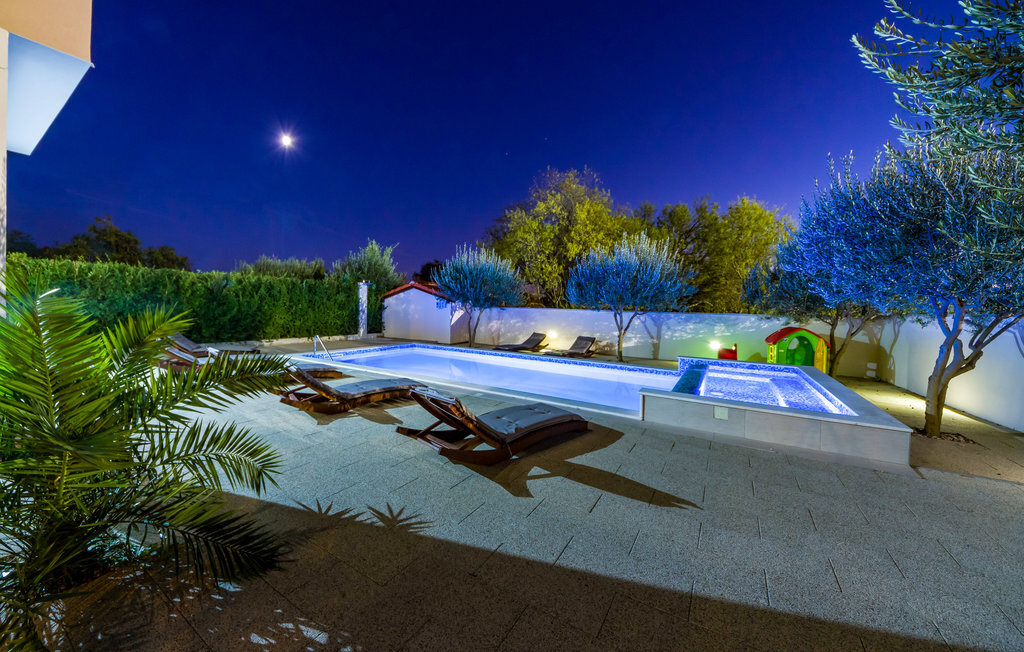 Radainovci est un village dalmate typique et pittoresque situé à proximité du lac Vrana et non loin de la ville attrayante de Biograd na Moru. C'est là que se trouve cette belle maison de vacances à l'équipement moderne. Elle se compose de deux appartements confortables et spacieux, reliés entre eux par un escalier intérieur. Sur le terrain bien entretenu, il y a une cuisine extérieure avec barbecue, des jeux en plein air et une piscine pour s'amuser et se rafraîchir. Au deuxième étage, il y a un sauna et une salle de fitness ainsi qu'une petite cuisine. Les terrasses sont idéales pour s'asseoir confortablement avec un verre de votre boisson préférée, tout en profitant du magnifique paysage et des couchers de soleil. Grâce à la proximité des principaux points de transport, les parcs nationaux de Krka, Paklenica et des lacs de Plitvice sont rapidement accessibles. Tous offrent une beauté naturelle unique.