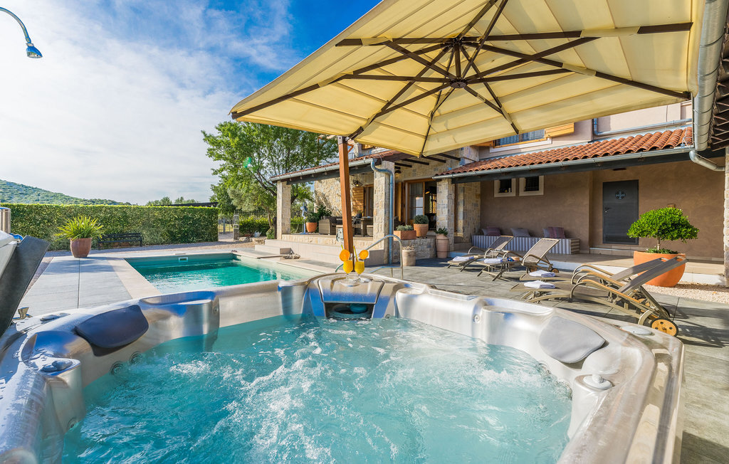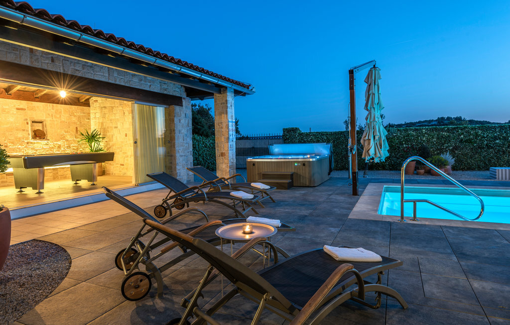 Bien-être à l'extérieur : Location de vacances disposant de chaises-longues et d'un ou plusieurs équipements tels que piscine extérieure, jacuzzi extérieur, lit à baldaquin de jardin etc...