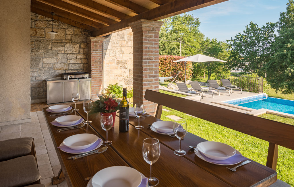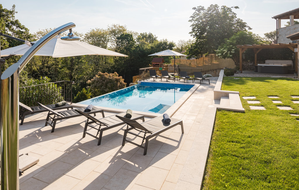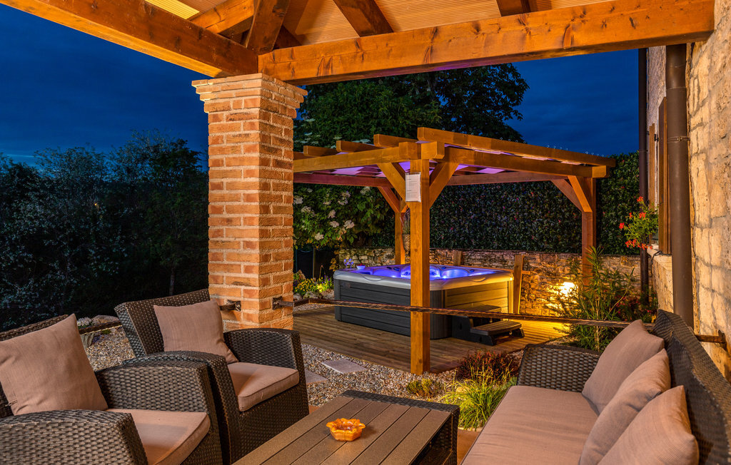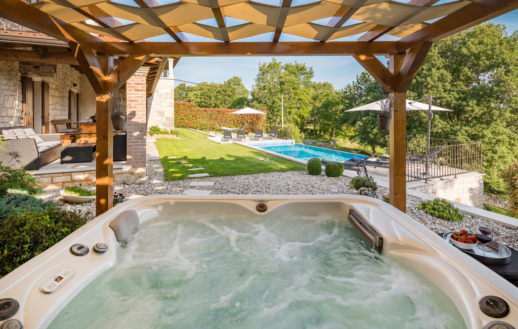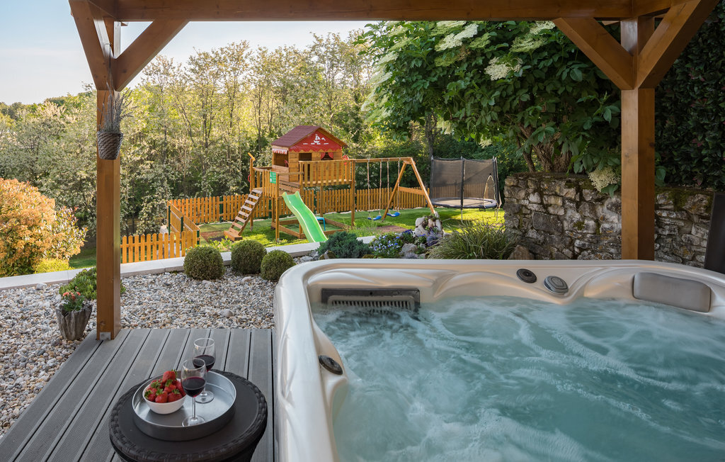 Bien-être à l'extérieur : Location de vacances disposant de chaises-longues et d'un ou plusieurs équipements tels que piscine extérieure, jacuzzi extérieur, lit à baldaquin de jardin etc...