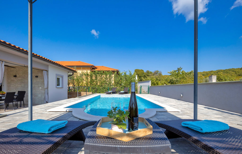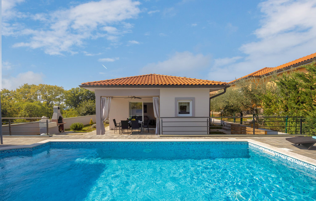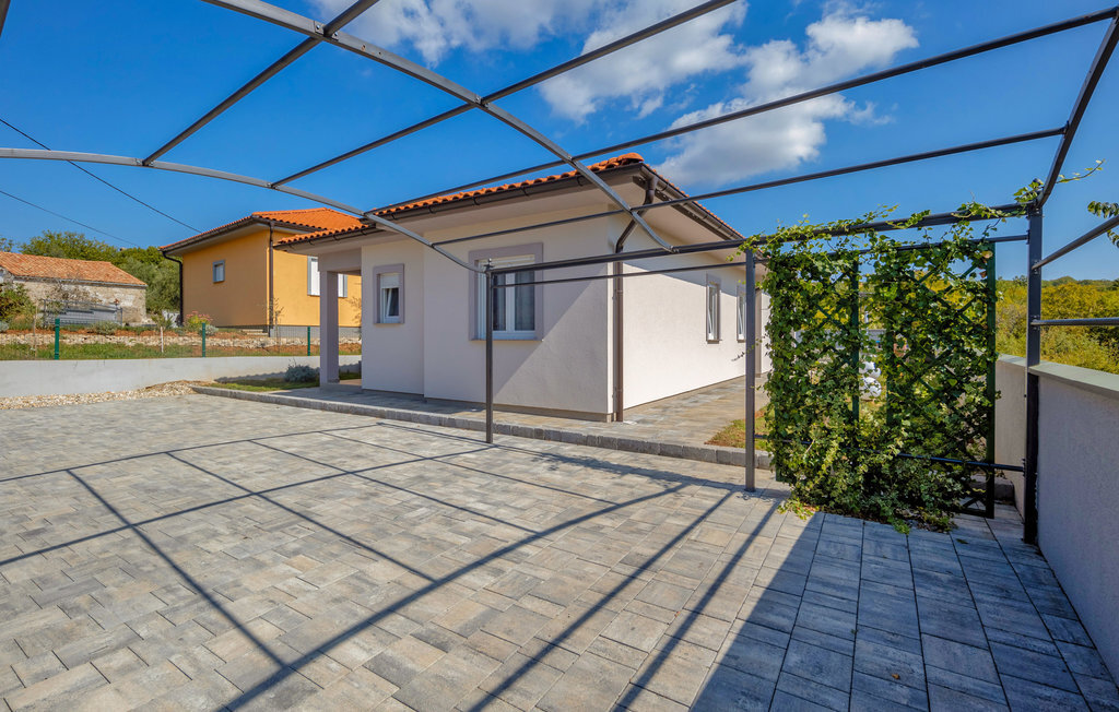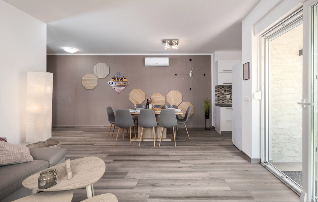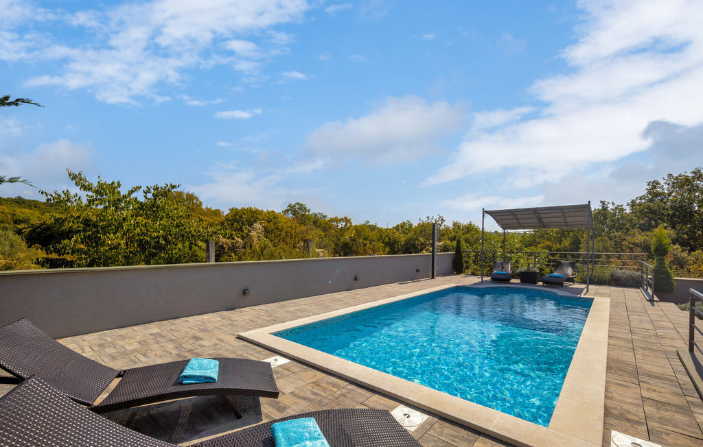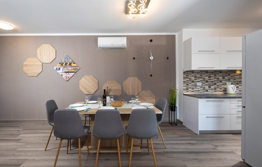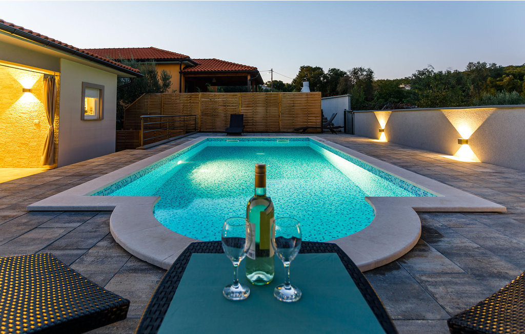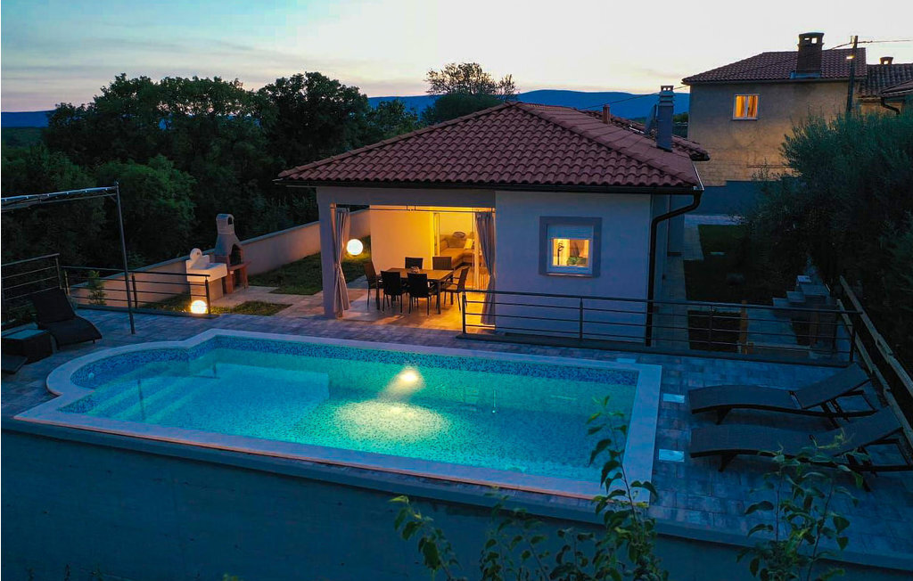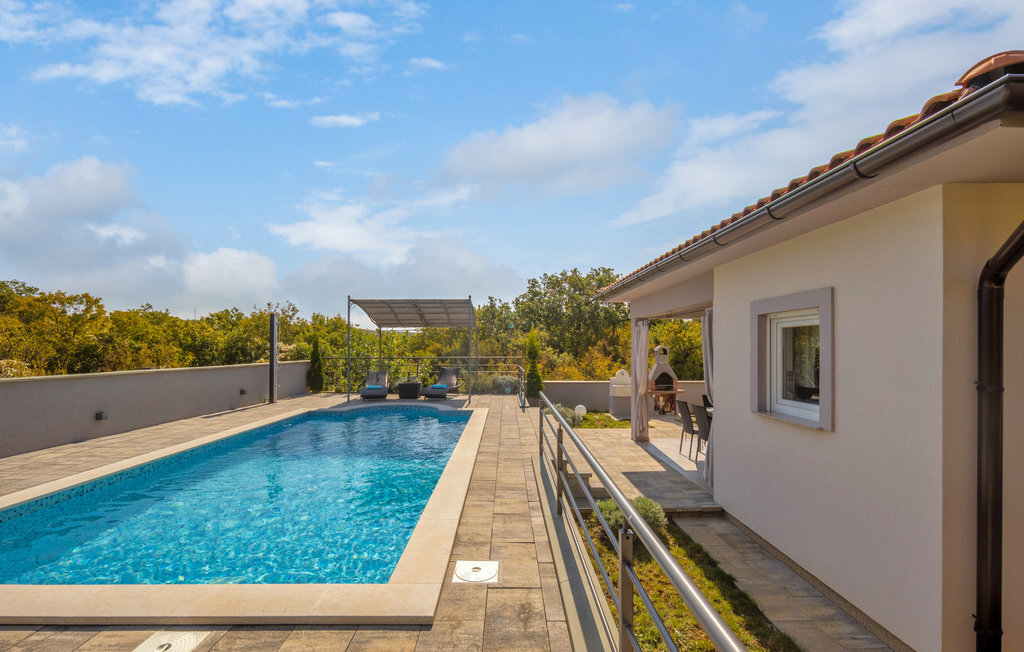 Cette maison de vacances avec piscine, aménagée avec goût, se trouve dans le petit village de Kapovci, à l'intérieur de l'île de Krk. Vous disposez d'une salle de séjour, de trois chambres à coucher et de deux salles de bains. Depuis le salon, vous avez accès à une terrasse couverte et, à côté, à la piscine où vous pourrez vous détendre et passer de bons moments. Le village de Kapovci est un endroit idéal pour explorer l'île avec une nature intacte et de belles plages. Découvrez le patrimoine culturel de l'île, explorez les sentiers de randonnée et les pistes cyclables, visitez l'île de Koljun et goûtez à la riche offre gastronomique en dégustant un bon vin de Vrbnik.