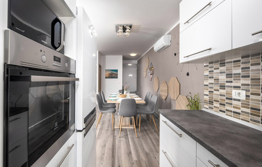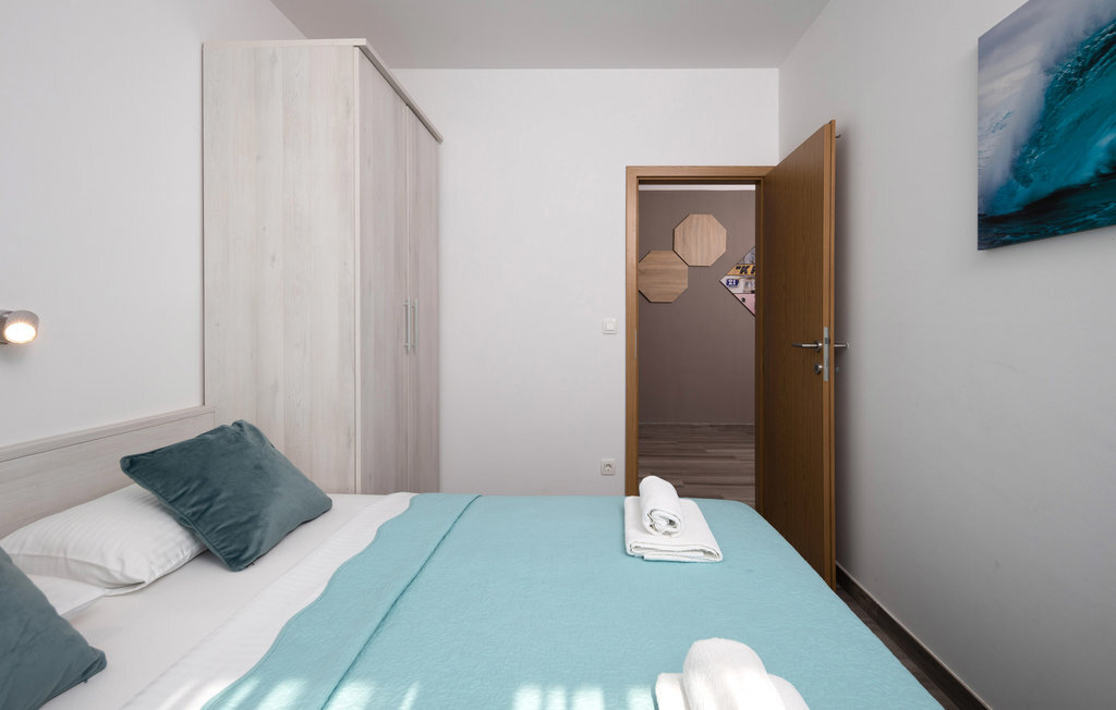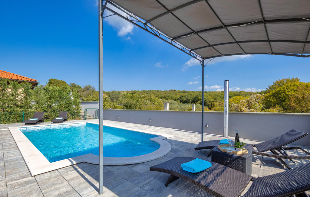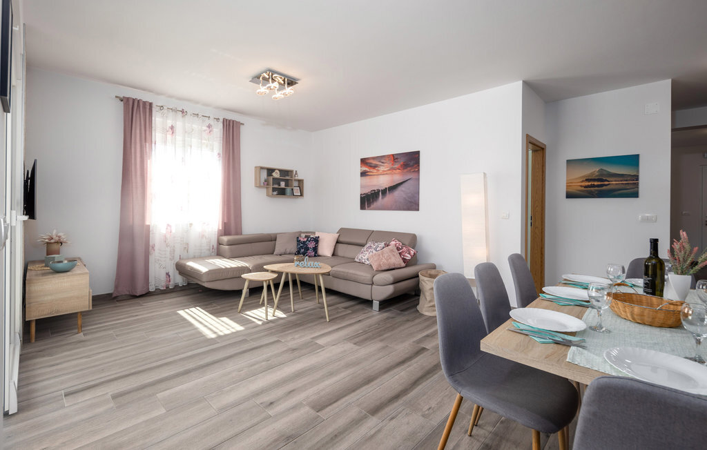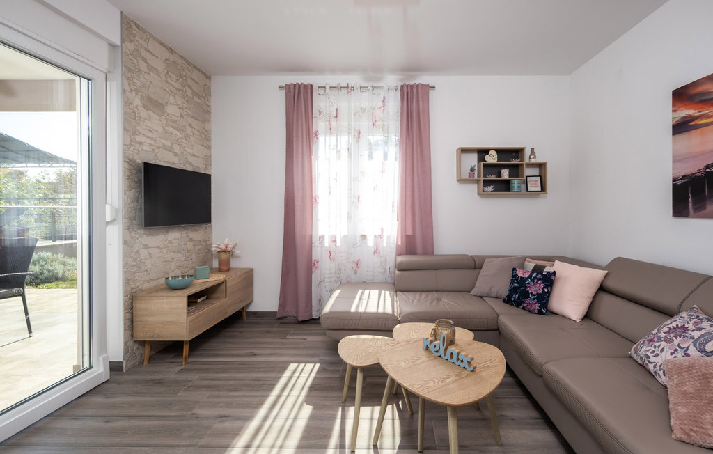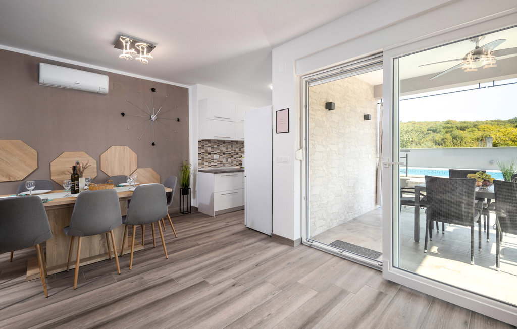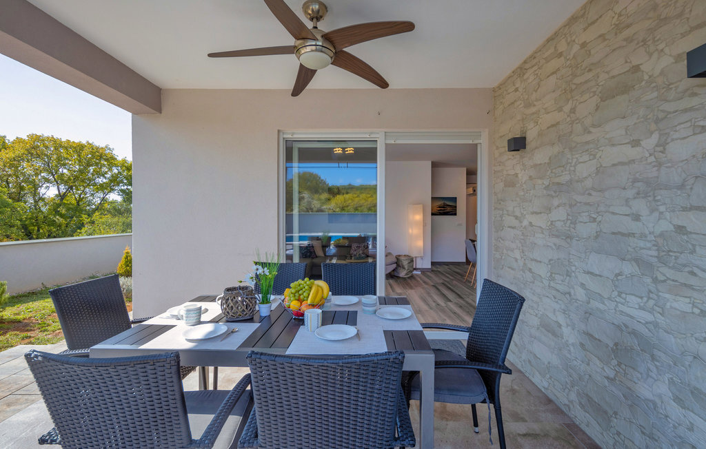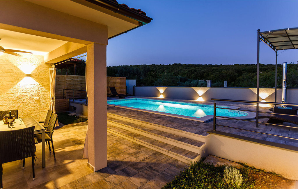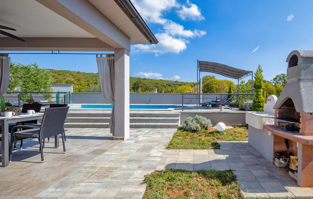 Cette maison de vacances avec piscine, aménagée avec goût, se trouve dans le petit village de Kapovci, à l'intérieur de l'île de Krk. Vous disposez d'une salle de séjour, de trois chambres à coucher et de deux salles de bains. Depuis le salon, vous avez accès à une terrasse couverte et, à côté, à la piscine où vous pourrez vous détendre et passer de bons moments. Le village de Kapovci est un endroit idéal pour explorer l'île avec une nature intacte et de belles plages. Découvrez le patrimoine culturel de l'île, explorez les sentiers de randonnée et les pistes cyclables, visitez l'île de Koljun et goûtez à la riche offre gastronomique en dégustant un bon vin de Vrbnik.