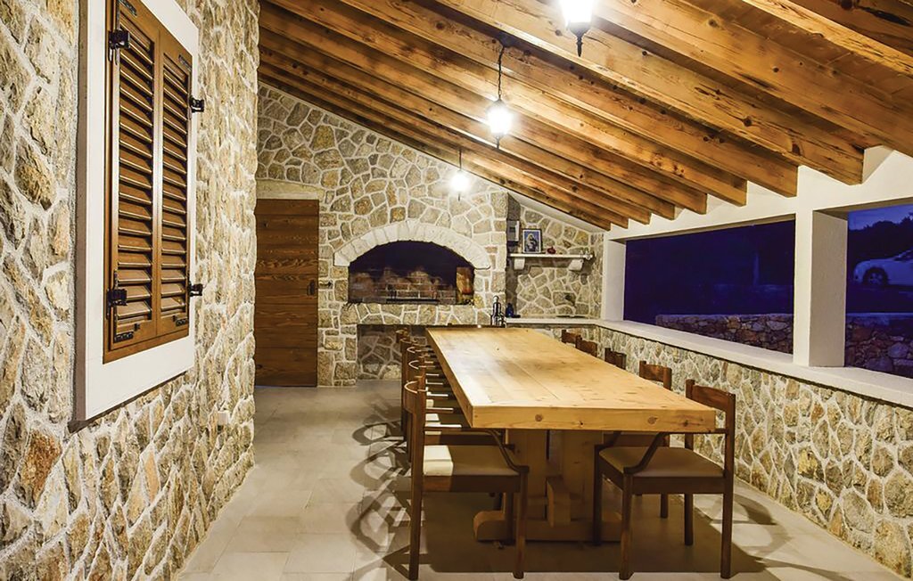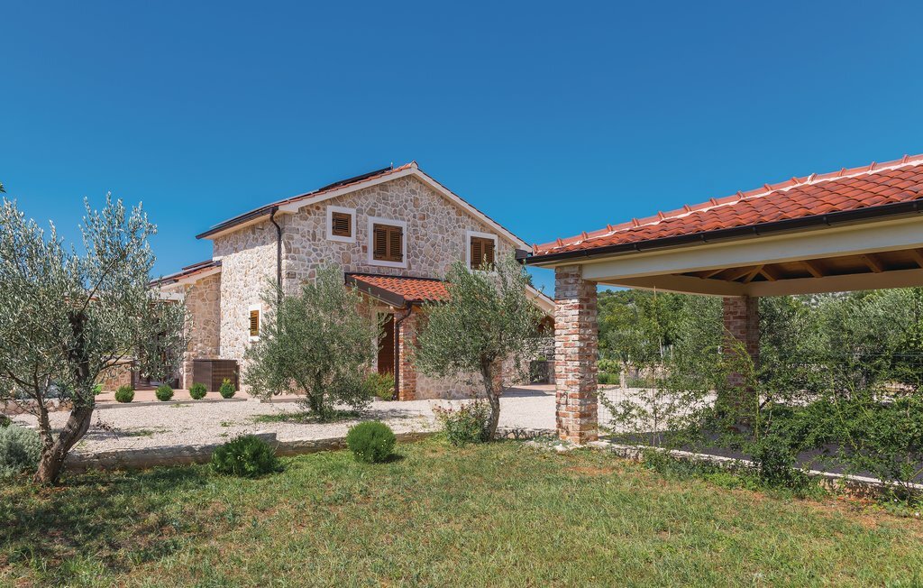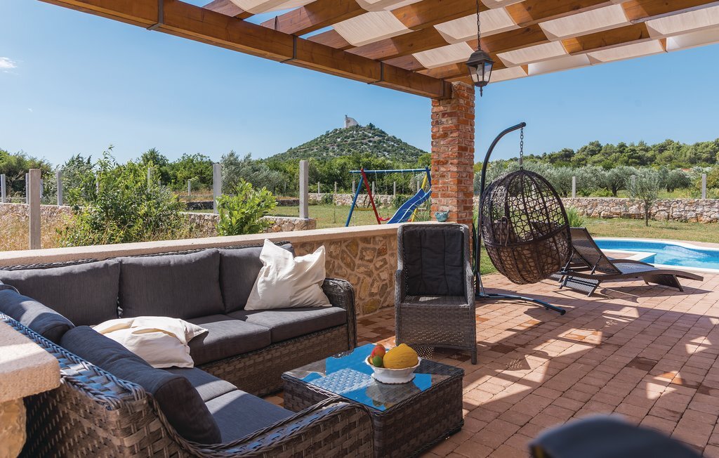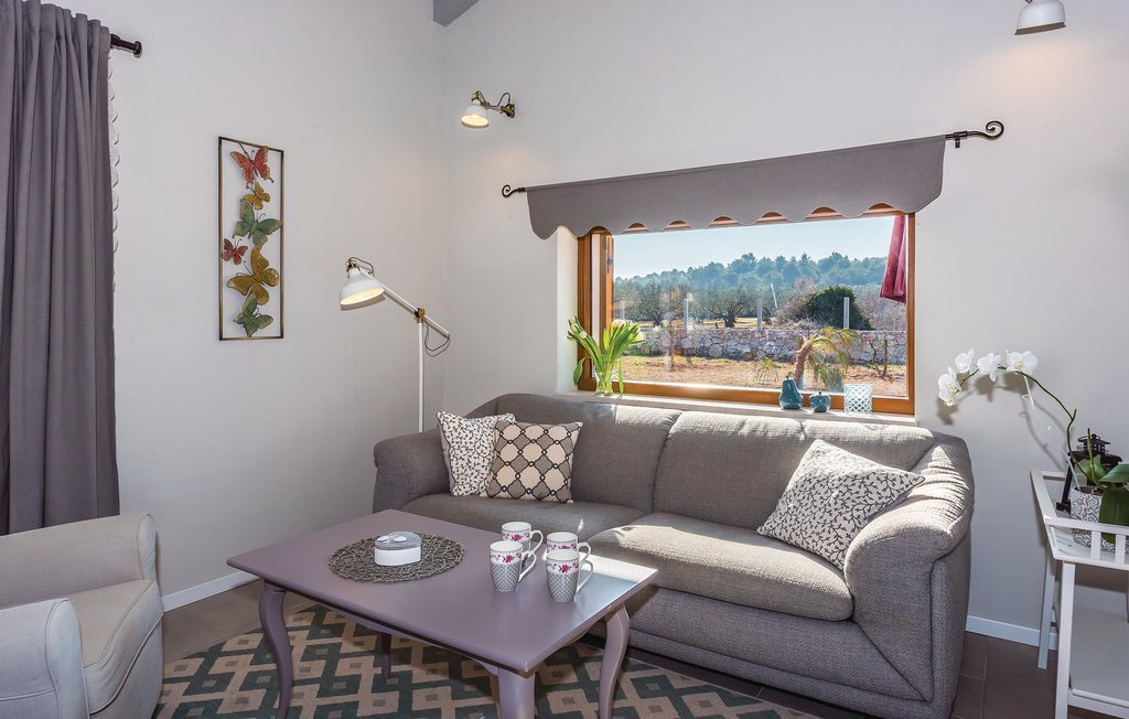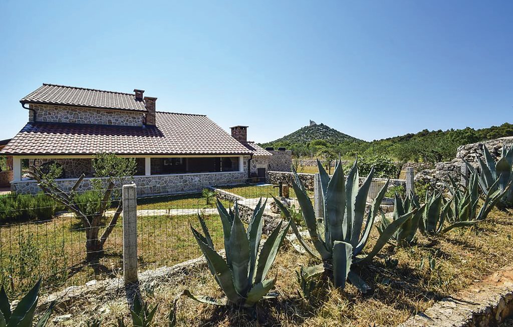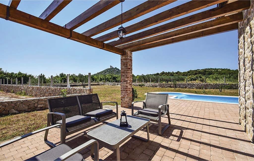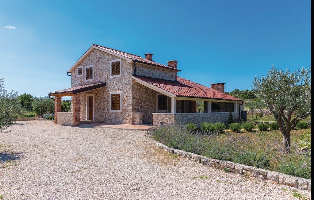 Cette belle maison dalmate en pierre est entourée d'oliviers et d'une nature intacte, à seulement 3,5 km environ de la pittoresque station touristique de Vodice. Tout l'intérieur est aménagé harmonieusement et avec goût. Un escalier en colimaçon permet d'accéder à l'étage supérieur dont le toit est incliné à environ 140 cm. Profitez du calme sur la terrasse ou rafraîchissez-vous dans la piscine avec buses de massage. Vodice offre aux vacanciers balnéaires de nombreuses belles plages de galets en pente douce et des criques de rêve. Terminez la soirée par une promenade romantique le long du front de mer ou dans les ruelles pittoresques de la vieille ville. Des panneaux solaires alimentent la maison en électricité, l'utilisation d'appareils électriques est limitée.