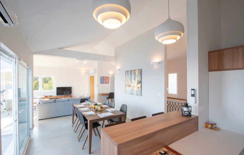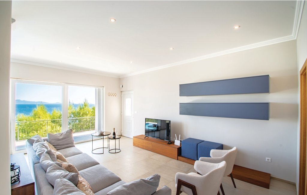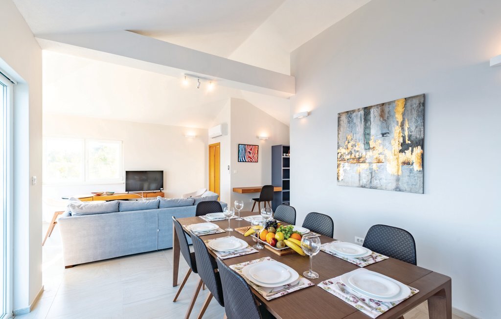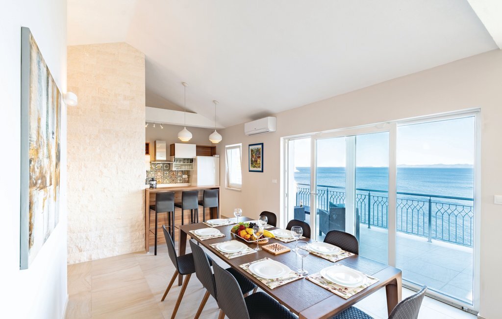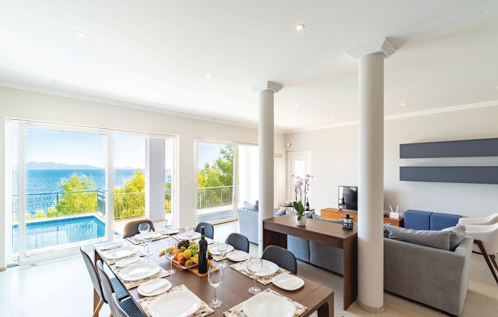 Cette magnifique maison de vacances avec piscine est située directement au bord de la mer, dans la petite baie de Vinaac, près de la ville de Brna, sur l'île de Korula. Des lignes claires, des détails luxueux et des matériaux de qualité complètent l'image globale élégante de cette villa. Les pièces se répartissent sur le rez-de-chaussée avec un salon spacieux et une cuisine entièrement équipée, une chambre à coucher principale avec salle de bain ainsi qu'une belle terrasse avec piscine et barbecue extérieur. Des escaliers intérieurs mènent au premier étage avec quatre chambres à coucher climatisées et leurs propres salles de bains ainsi que des sorties sur des balcons avec vue sur la mer. Au deuxième étage se trouvent encore une belle cuisine avec salon ainsi qu'une terrasse avec vue sur la mer. Le domicile est situé à quelques mètres de la mer, où des marches mènent à la plateforme en béton où vous pouvez vous baigner.