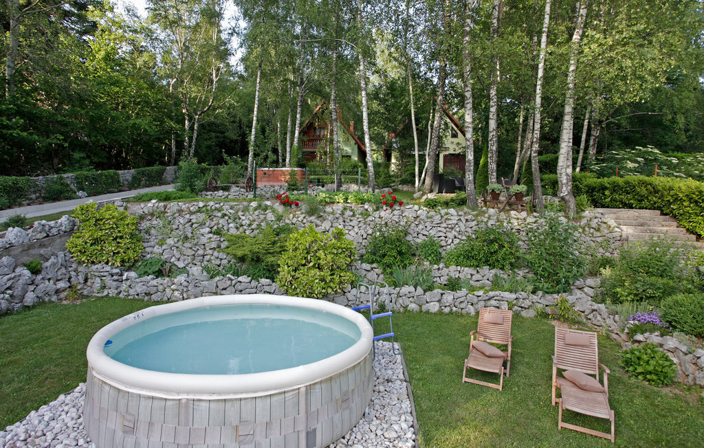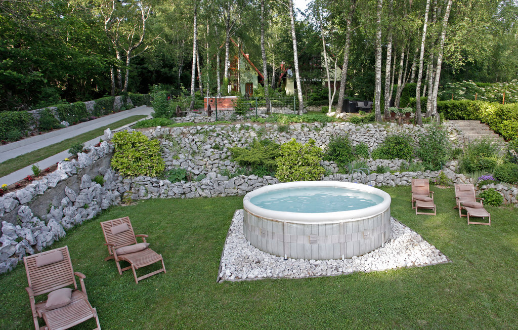 Bien-être à l'extérieur : Location de vacances disposant de chaises-longues et d'un ou plusieurs équipements tels que piscine extérieure, jacuzzi extérieur, lit à baldaquin de jardin etc...