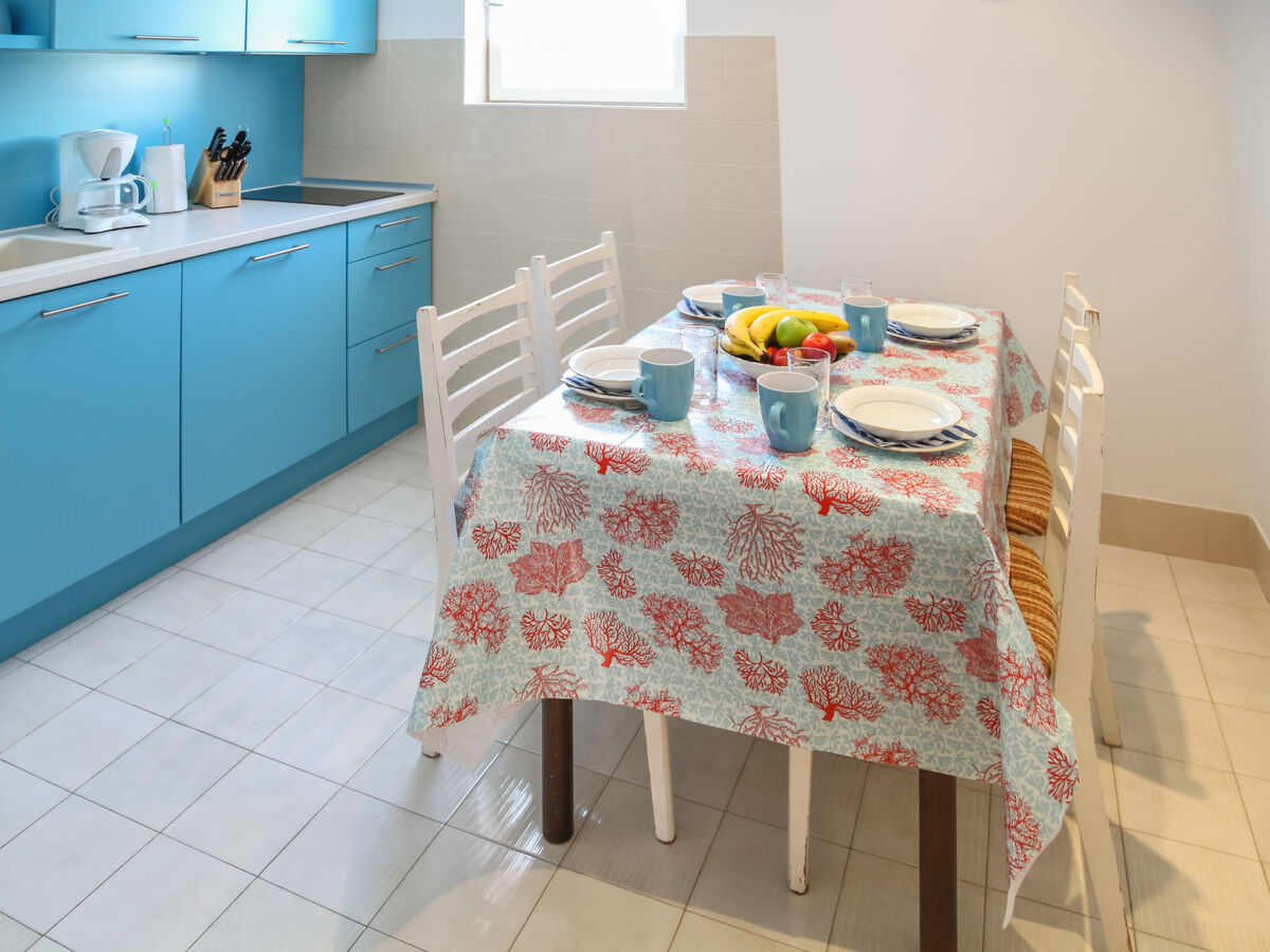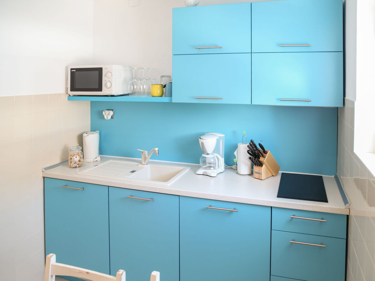 Cuisine (lave-vaisselle, 2 plaques vitrocéramiques, micro-ondes, cafetière électrique) avec table pour les repas.