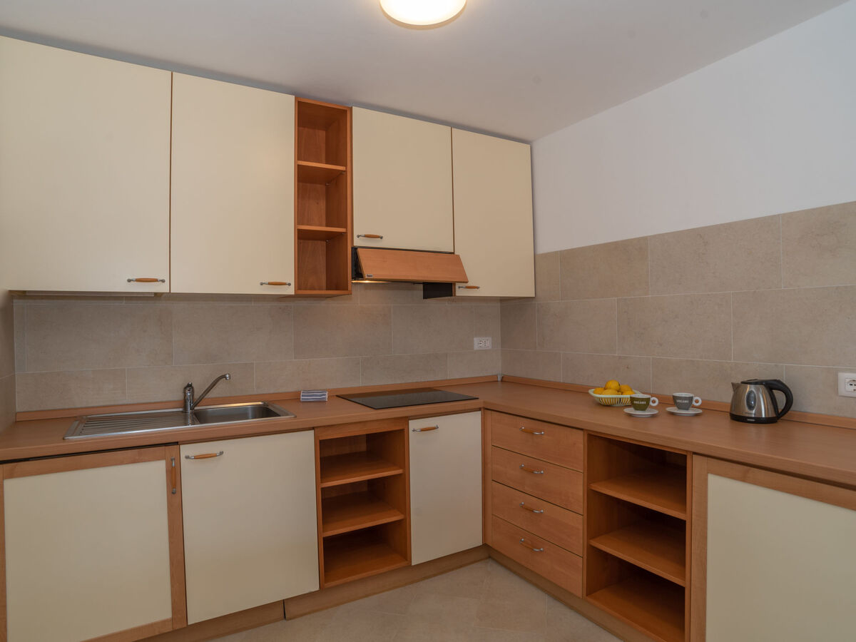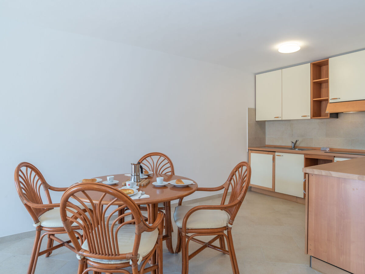 Coin cuisine (4 plaques de cuisson) avec table pour les repas.