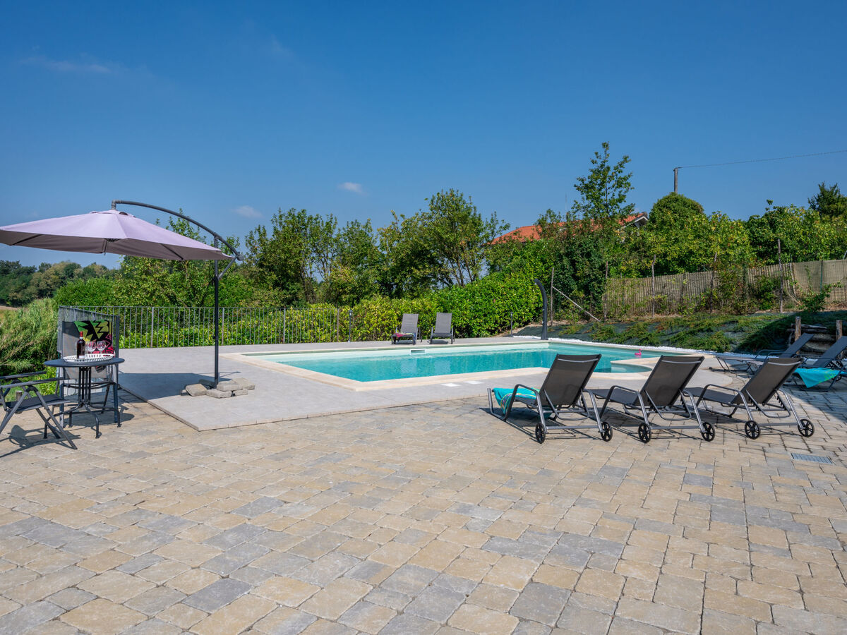 A usage privé: terrain 2'000 m2 (clôturé), jardin entretenu avec plantes et arbres, cour, piscine (10 x 5 m, profondeur 150 cm, disponibilité saisonnière: 01.Mai.