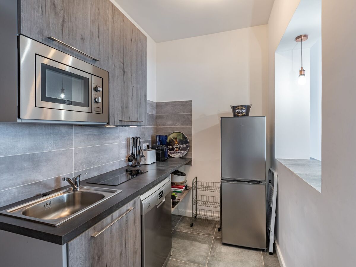 Petite cuisine ouverte (lave-vaisselle, 2 plaques à induction, grille-pain, bouilloire électrique, micro-ondes, congélateur, cafetière électrique, Capsules pour machine à café (nespresso) (NON INCLUSES)).