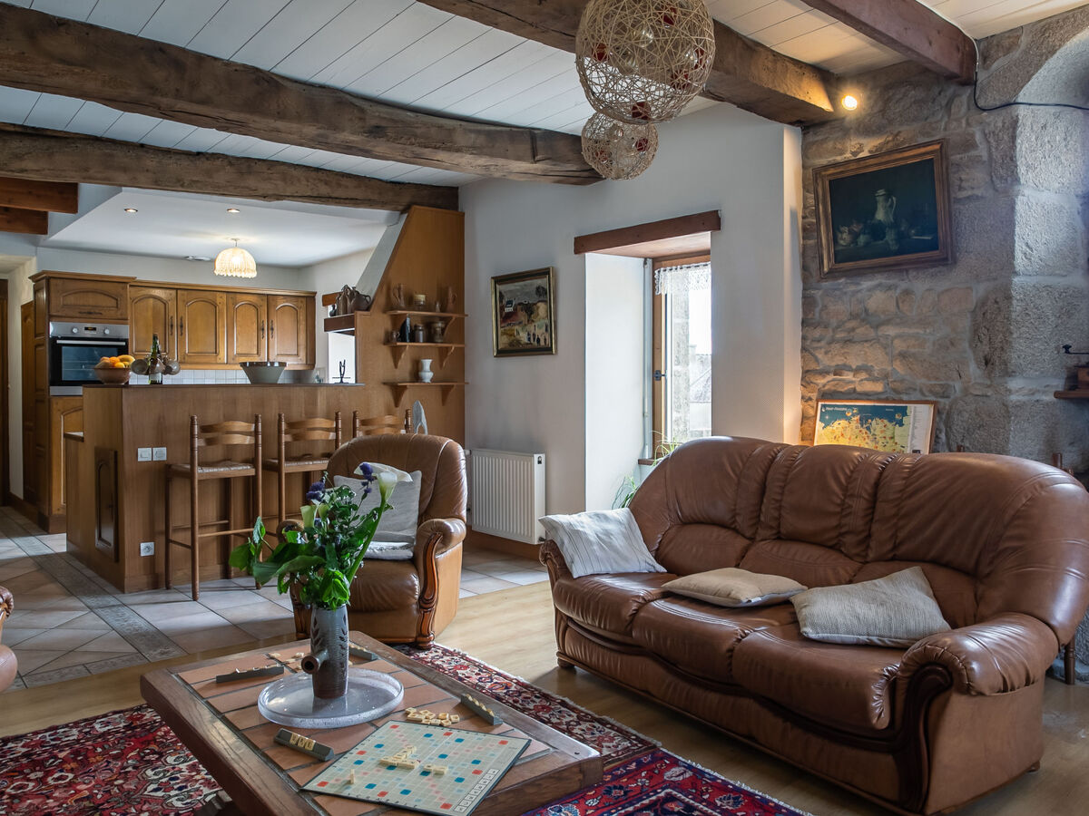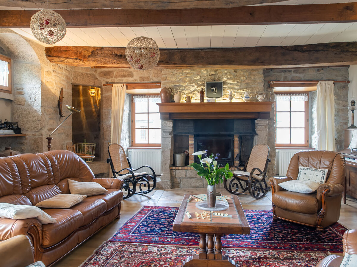 Aménagement agréable et rustique: à l'étage supérieur: séjour/salle à manger avec cheminée, table pour les repas, TV, chaînes de TV internationales, radio, lecteur CD et DVD.