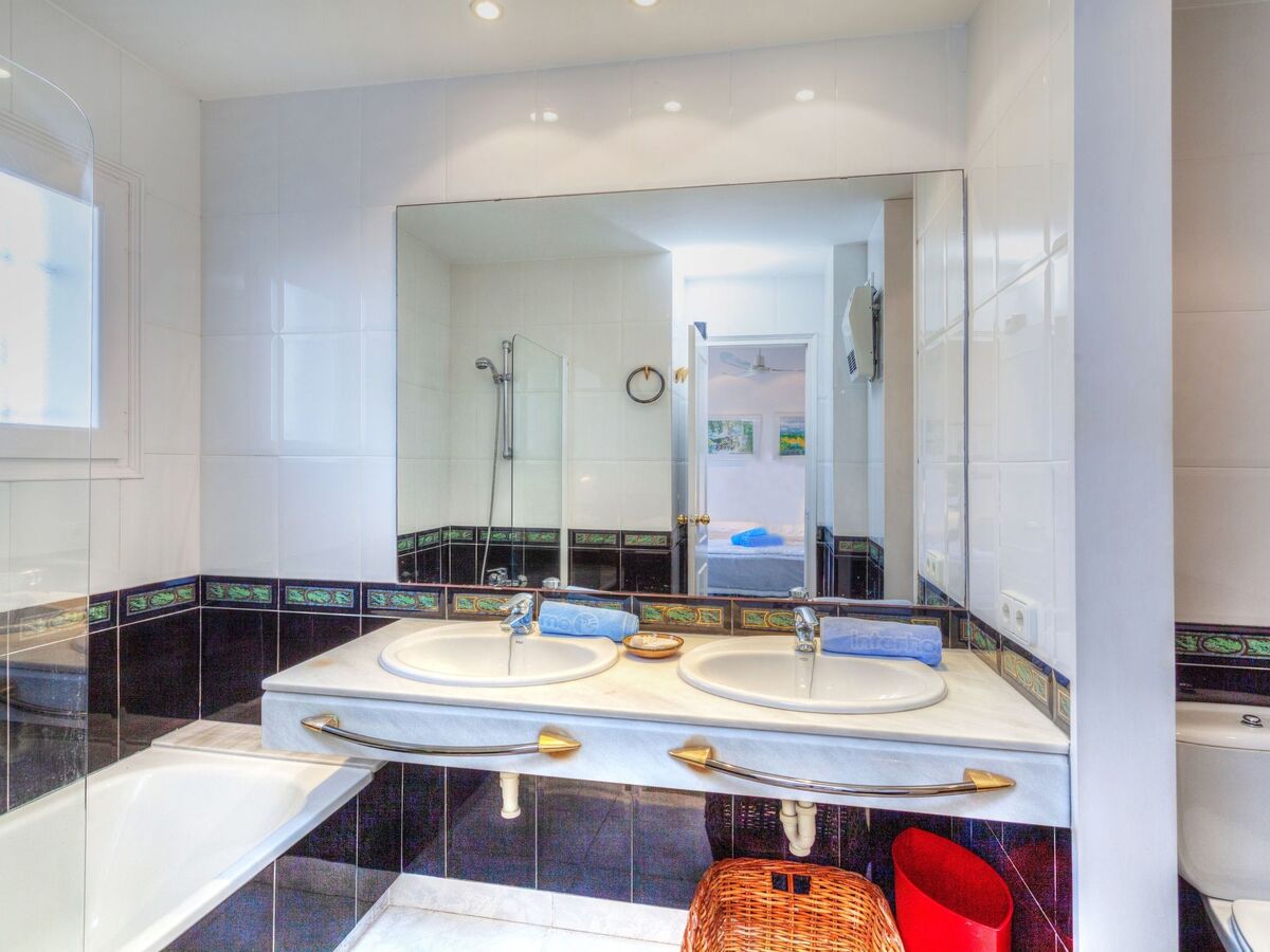 1 chambre avec 1 grand-lit (150 cm, longueur 190 cm), bain/bidet/WC, double vasque et TV.