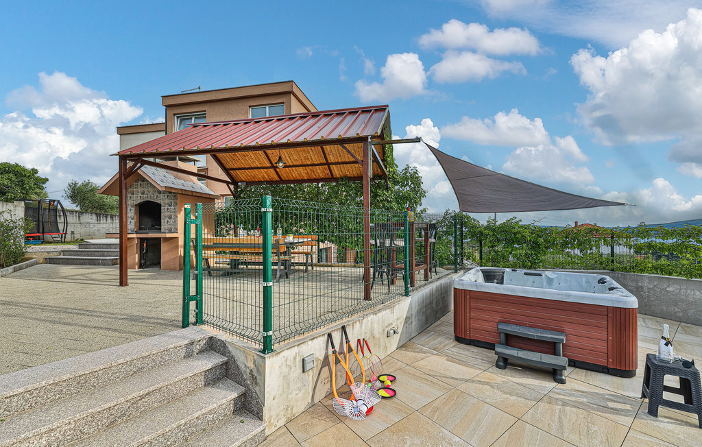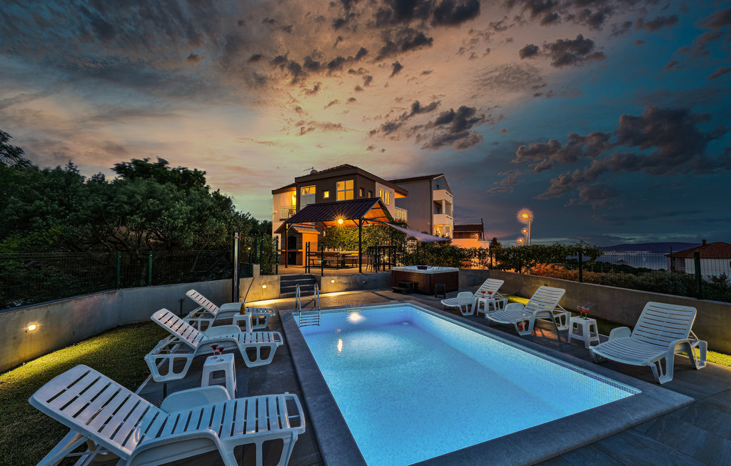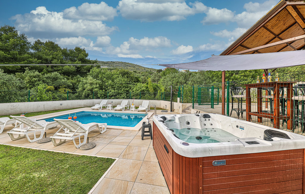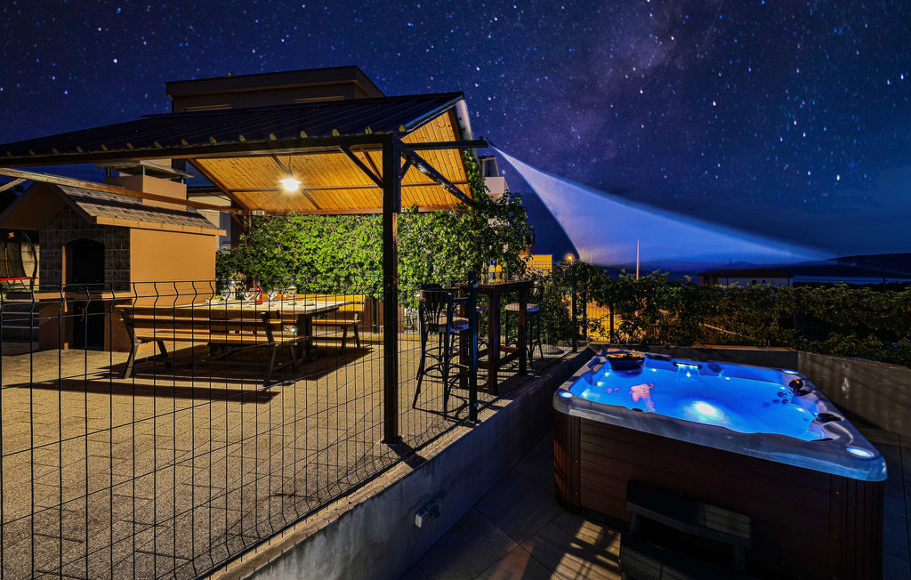 Bien-être à l'extérieur : Location de vacances disposant de chaises-longues et d'un ou plusieurs équipements tels que piscine extérieure, jacuzzi extérieur, lit à baldaquin de jardin etc...