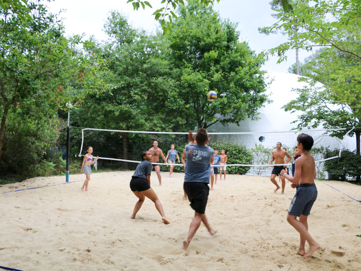 WC dans l'espace piscine, douche extérieure, terrain de pétanque, beach volley, espace de jeux pour les enfants.