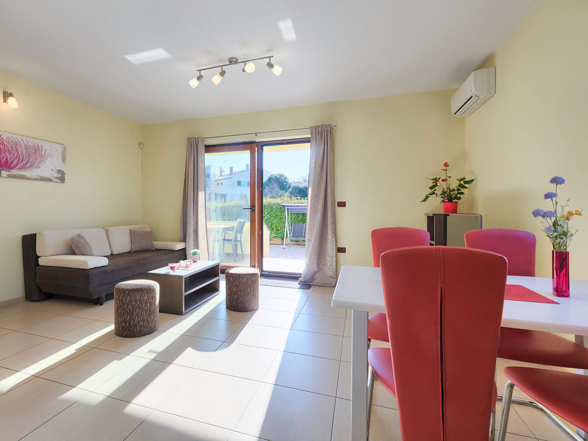 Séjour/salle à manger avec 1 divan-lit double (160 cm, longueur 200 cm), coin-cuisine et TV (satellite) (écran plat), air-conditionné.