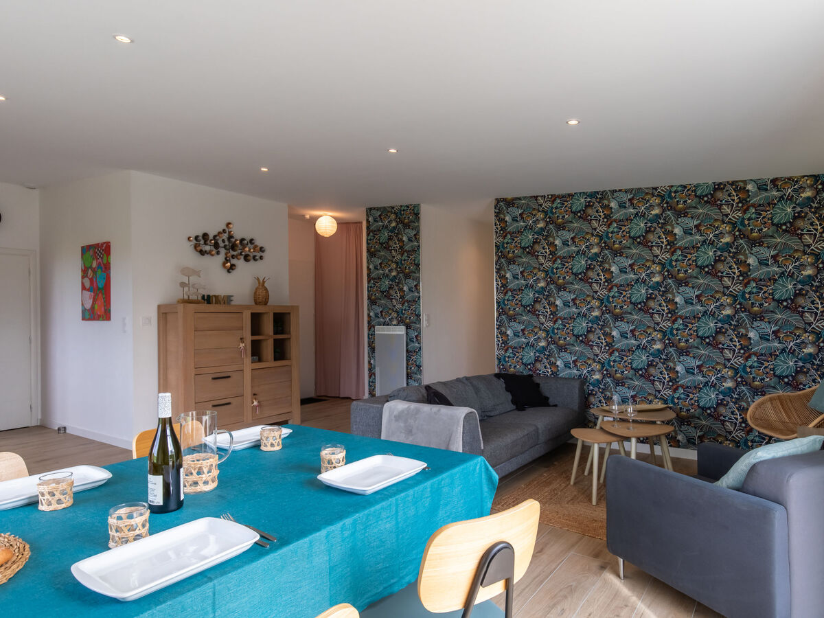 Clair, aménagement de bon goût: séjour/salle à manger avec table pour les repas, TV, chaîne stéréo et DVD.