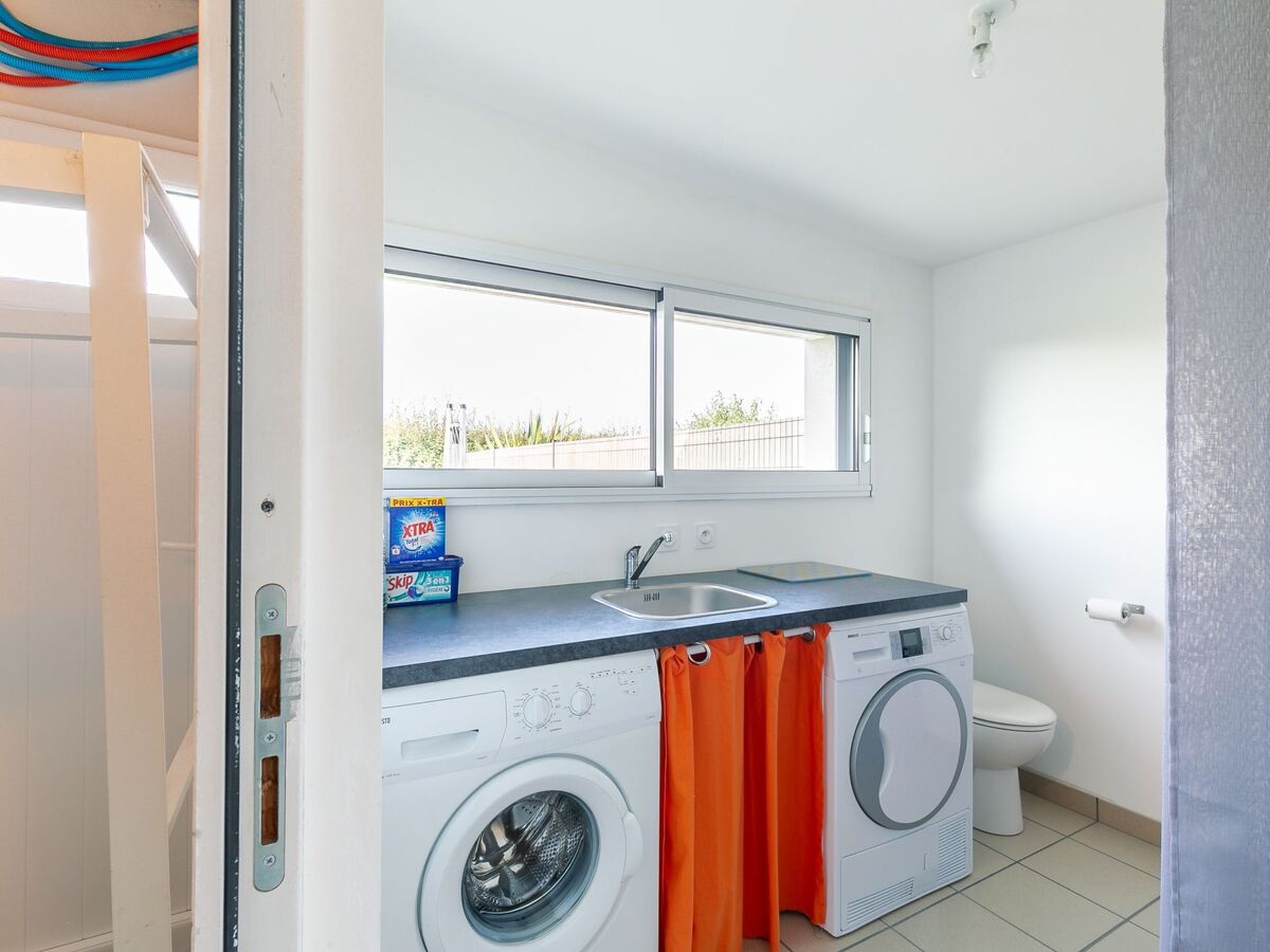 A disposition: lave-linge, sèche-linge, chaise haute pour enfant, lit bébé.