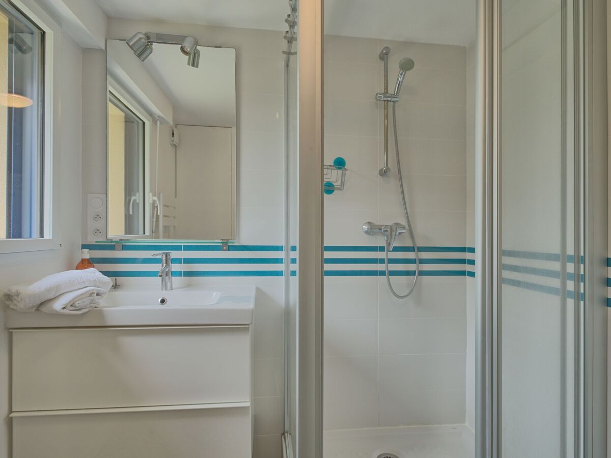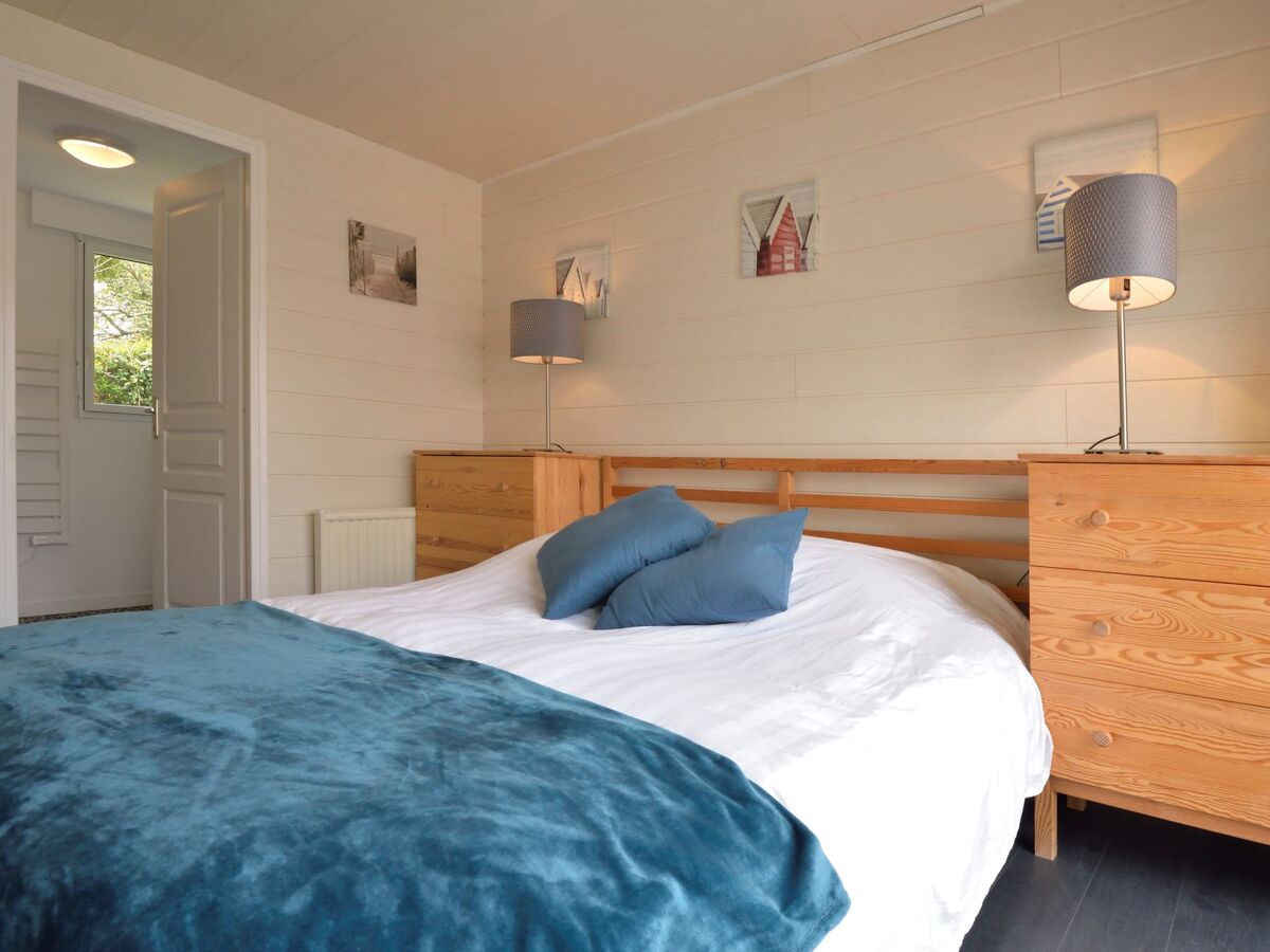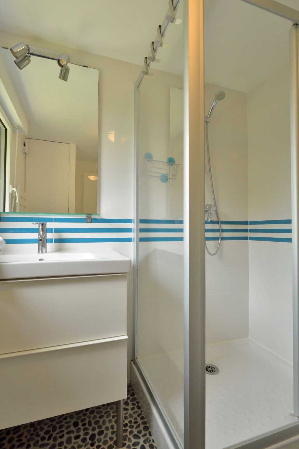 1 chambre avec baie vitrée avec 1 grand-lit (160 cm, longueur 200 cm), douche/WC.