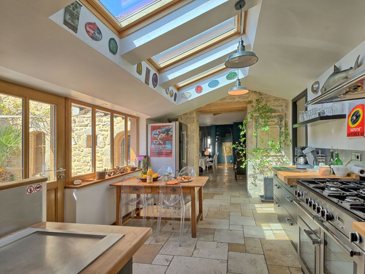 Cuisine ouverte (four, lave-vaisselle, Poêle à gaz, 6 feux, grille-pain, bouilloire électrique, micro-ondes, congélateur, gril, cafetière électrique) avec petite table pour les repas.