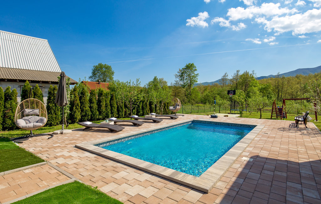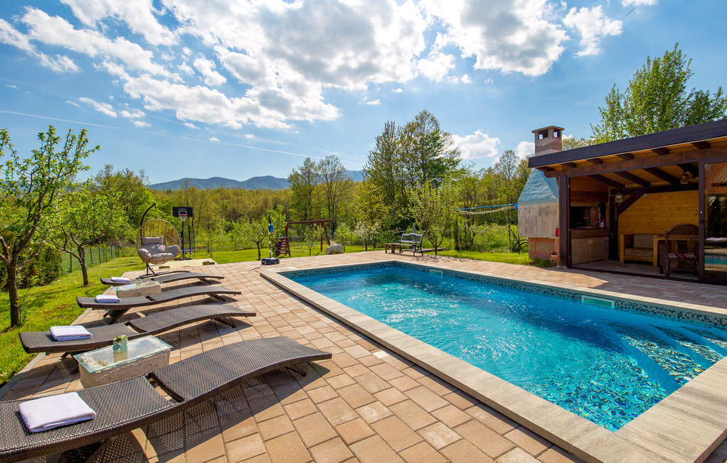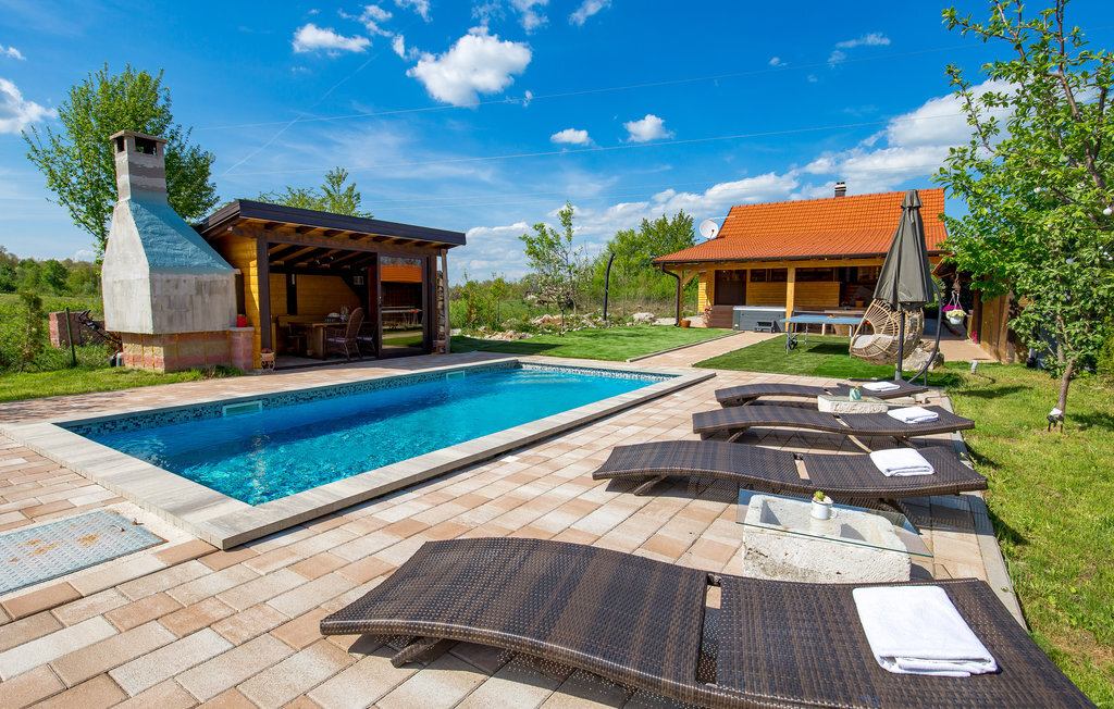 Bien-être à l'extérieur : Location de vacances disposant de chaises-longues et d'un ou plusieurs équipements tels que piscine extérieure, jacuzzi extérieur, lit à baldaquin de jardin etc...
