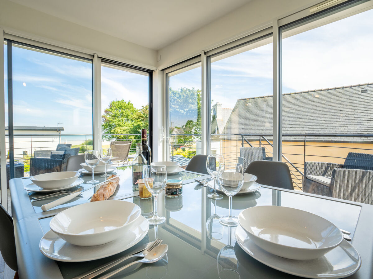 À l'étage supérieur: séjour/salle à manger avec table pour les repas, bar, TV et écran plat.
