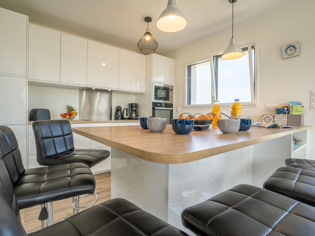 Cuisine ouverte (four, lave-vaisselle, 4 plaques à induction, grille-pain, bouilloire électrique, micro-ondes, congélateur, cafetière électrique).