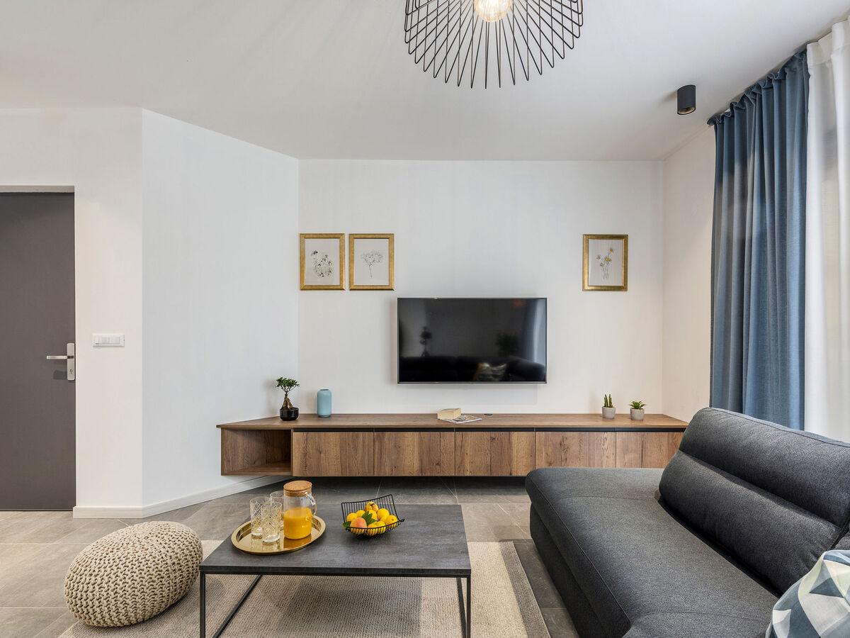 Aménagement moderne: séjour/salle à manger avec TV (satellite) et air-conditionné.
