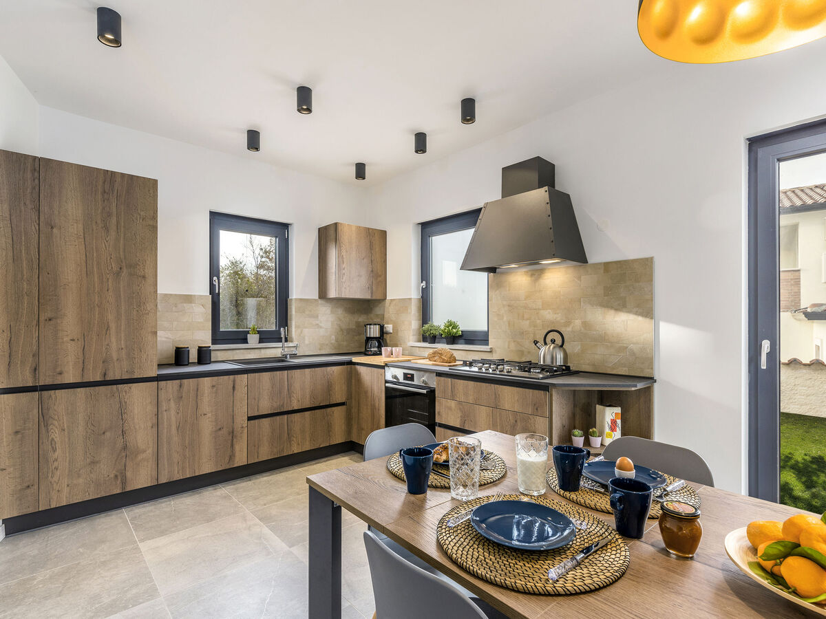 Cuisine ouverte (four, lave-vaisselle, 5 feux, grille-pain, bouilloire électrique, congélateur, cafetière électrique).