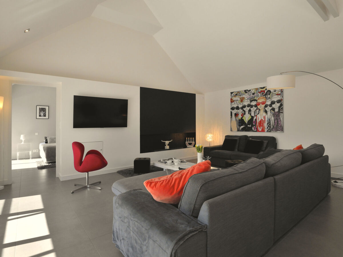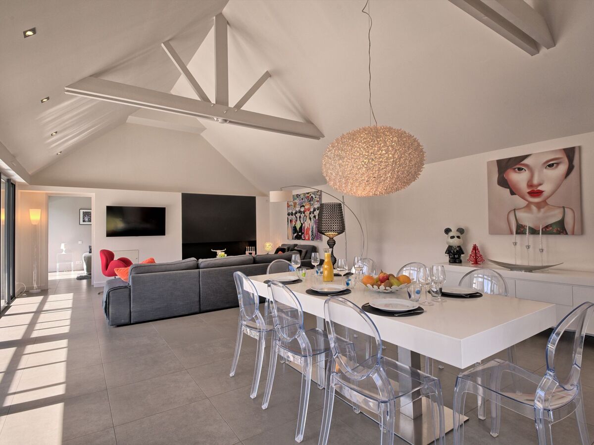 Aménagement moderne: séjour/salle à manger avec table pour les repas, TV et chaînes de TV internationales.
