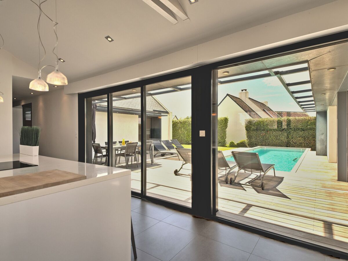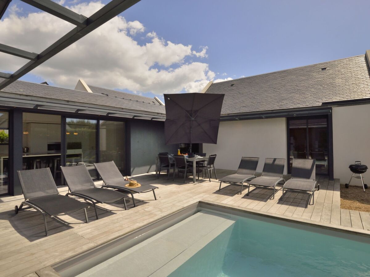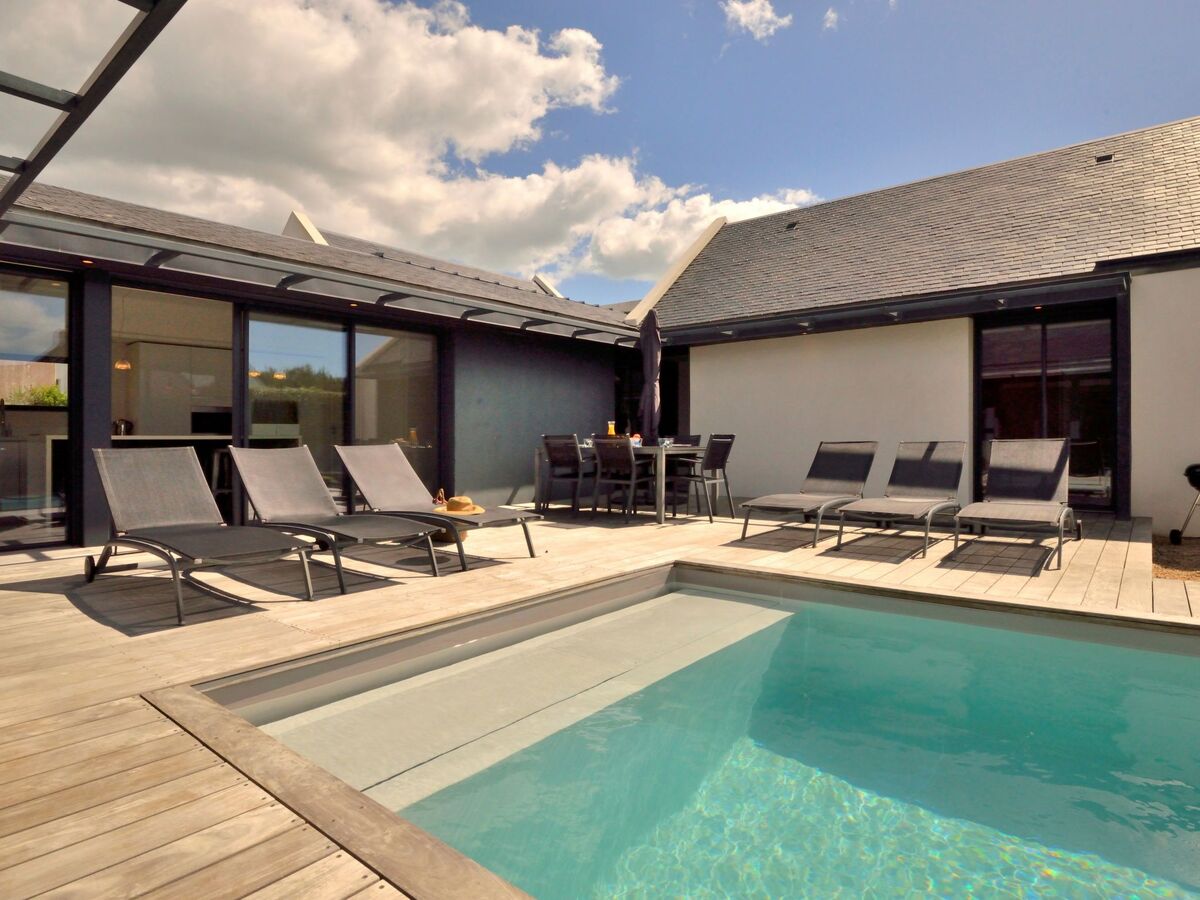 A usage privé: terrain 800 m2 (clôturé) avec pelouse et plantes, piscine chauffée (9 x 3 m, profondeur 130 cm, disponibilité saisonnière: 09.Avr.