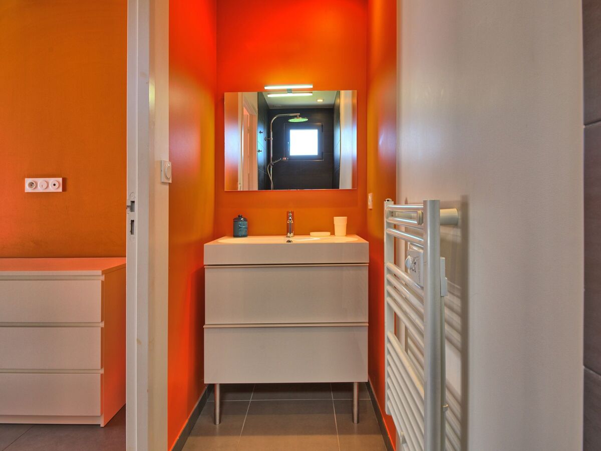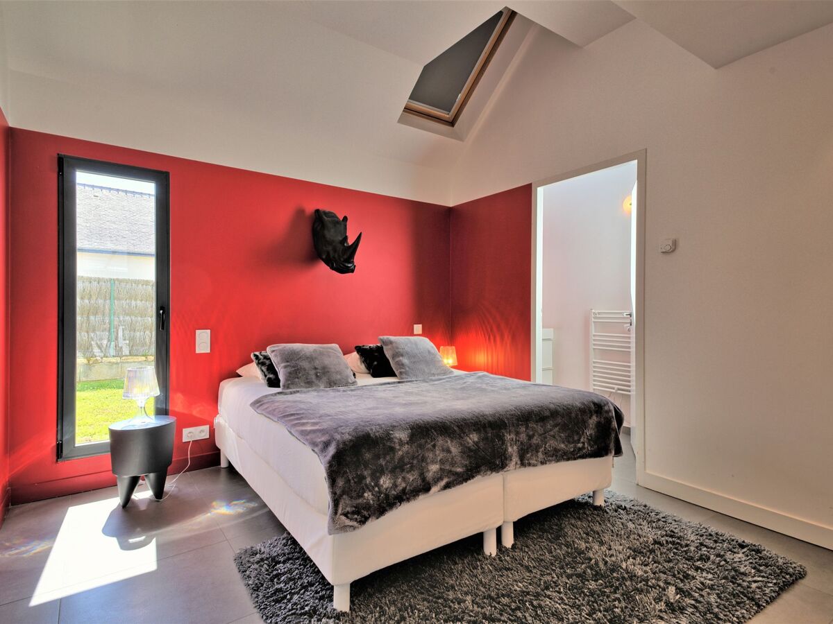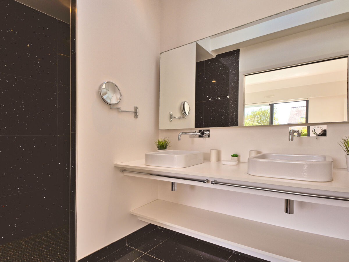 1 chambre avec 1 grand-lit (160 cm, longueur 200 cm), douche/WC et double vasque.