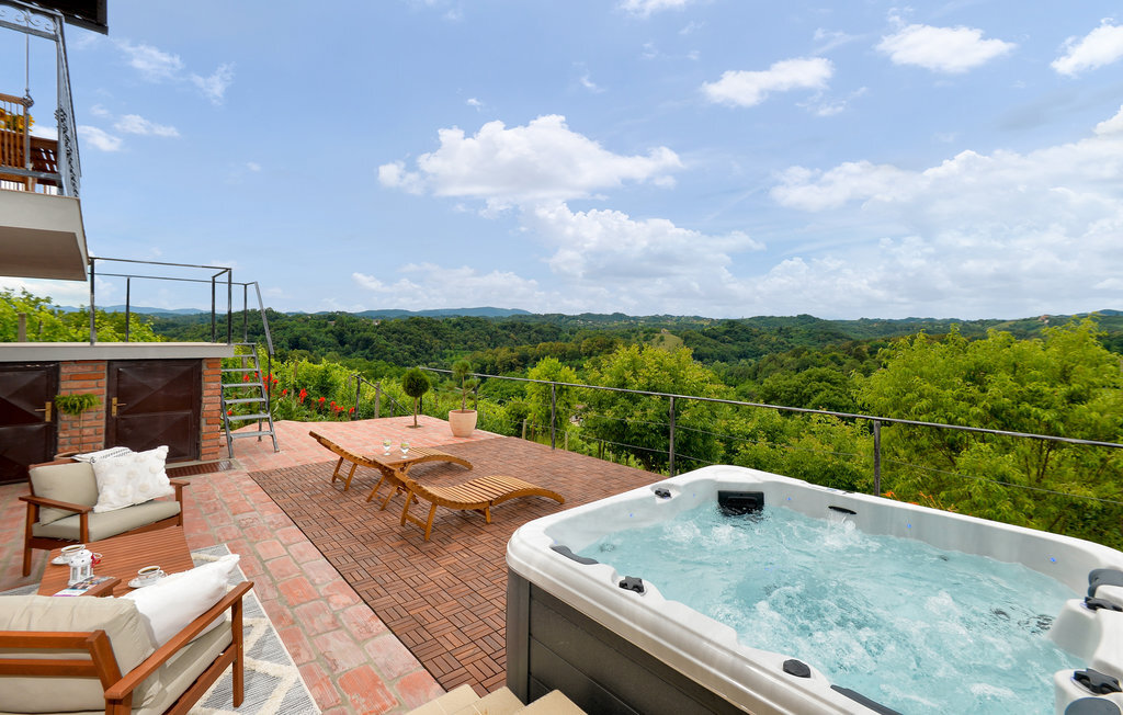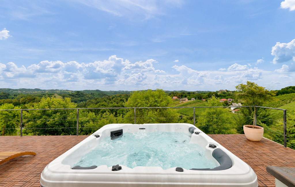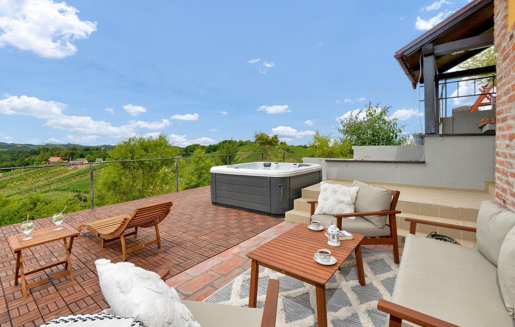 Bien-être à l'extérieur : Location de vacances disposant de chaises-longues et d'un ou plusieurs équipements tels que piscine extérieure, jacuzzi extérieur, lit à baldaquin de jardin etc...