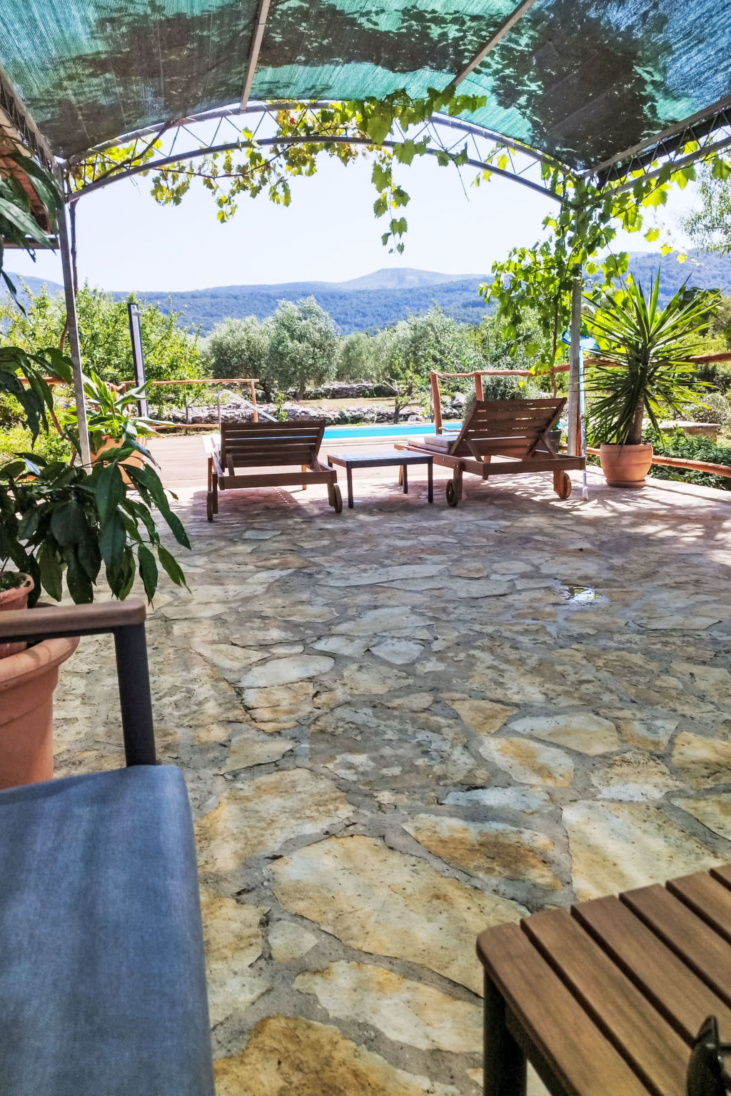 Vue sur la piscine et les alentours.
