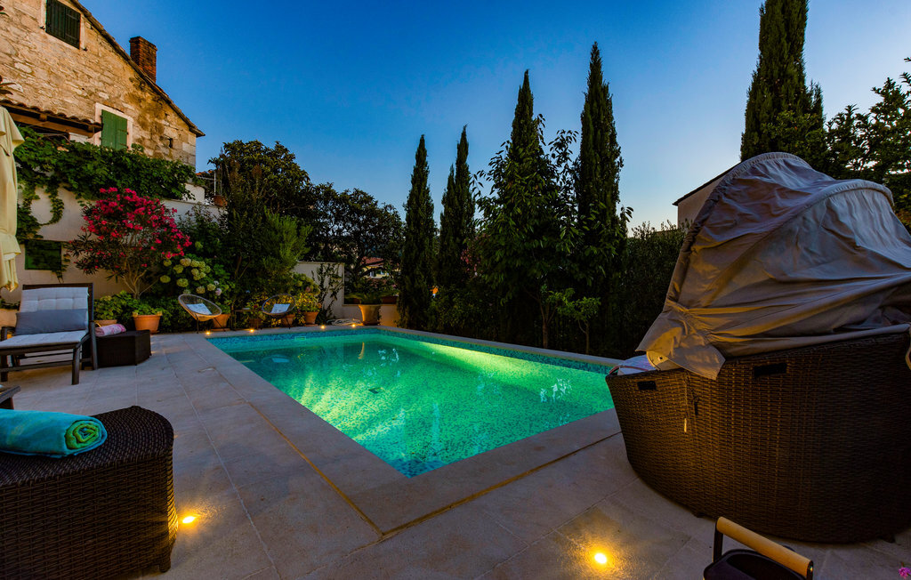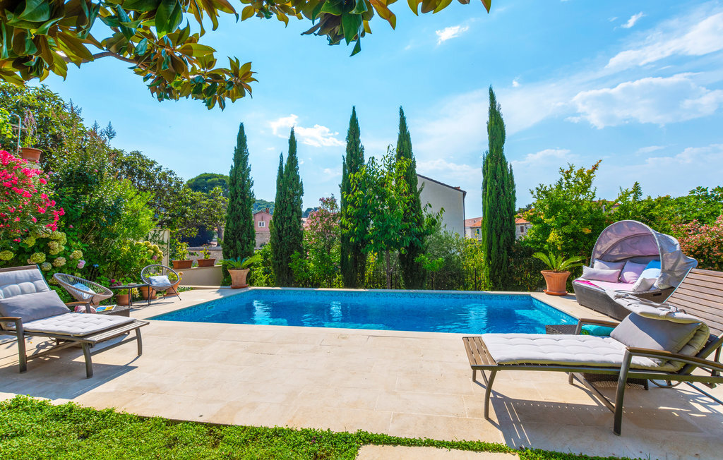 Bien-être à l'extérieur : Location de vacances disposant de chaises-longues et d'un ou plusieurs équipements tels que piscine extérieure, jacuzzi extérieur, lit à baldaquin de jardin etc...