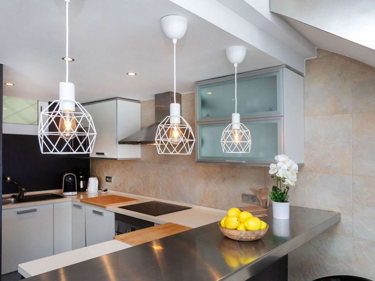 Grande cuisine ouverte (four, lave-vaisselle, 4 plaques à induction, micro-ondes, congélateur, cafetière électrique) avec table pour les repas.