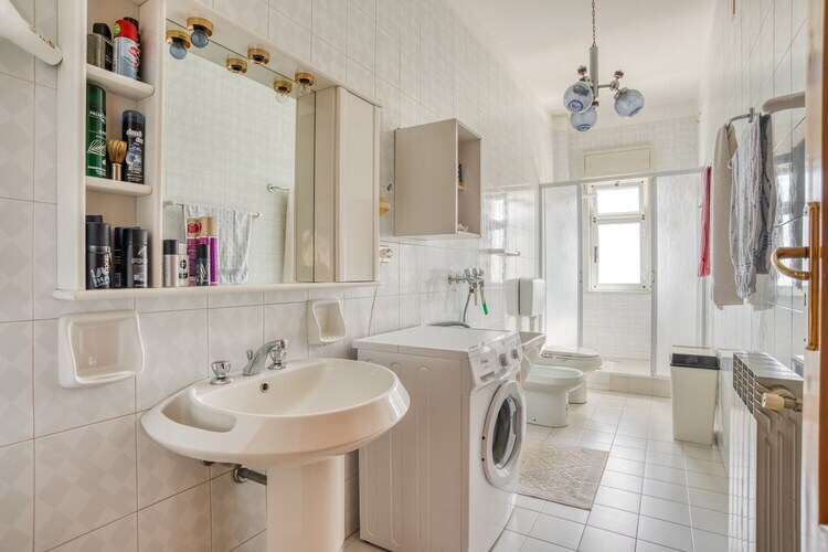 Au 1er étage: (couloir(coin salon), Salle de séjour(Canapé-lit simple, canapé-lit double, TV, table, coin salon), cuisine(bouilloire, plaque de cuisson, cafetière/percolateur, machine à café expresso, four, micro ondes, lave-vaisselle , combinaison réfrigérateur/congélateur), chambre(lit double), chambre(lit double, canapé-lit double), chambre(lit simple), salle de bains(douche, lavabo, WC, lave-linge , table à repasser, fer à repasser), salle de bains(baignoire, lavabo, WC), balcon, balcon)
