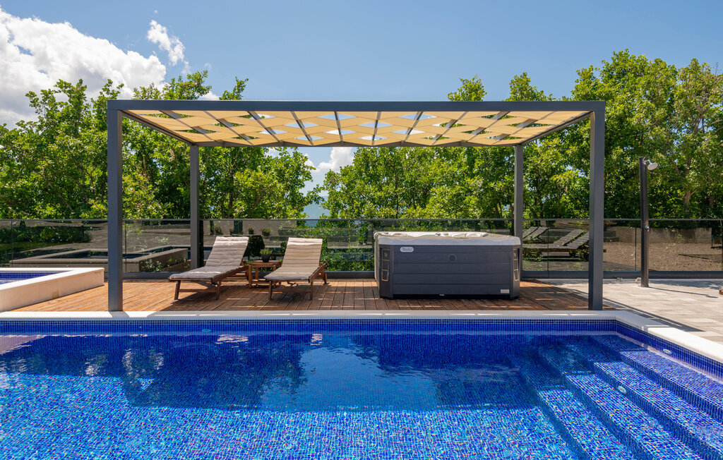 Bien-être à l'extérieur : Location de vacances disposant de chaises-longues et d'un ou plusieurs équipements tels que piscine extérieure, jacuzzi extérieur, lit à baldaquin de jardin etc...