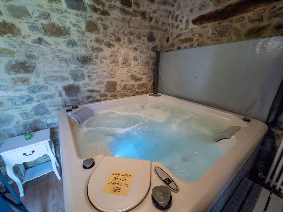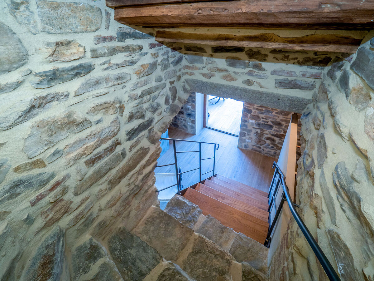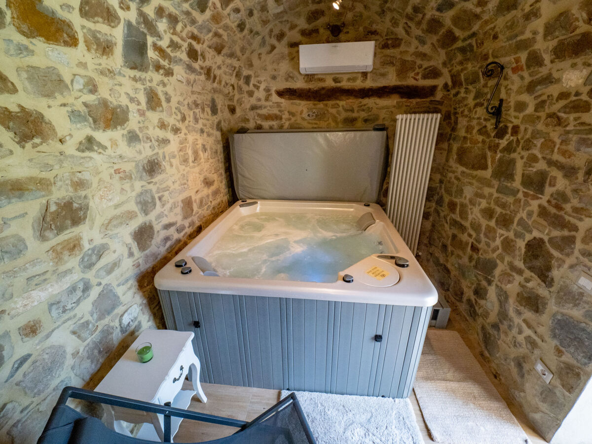 Depuis le salon, un escalier en pierre naturelle mène à l'espace bien-être avec un grand bain à remous dans la cave voûtée en pierre naturelle de la maison.