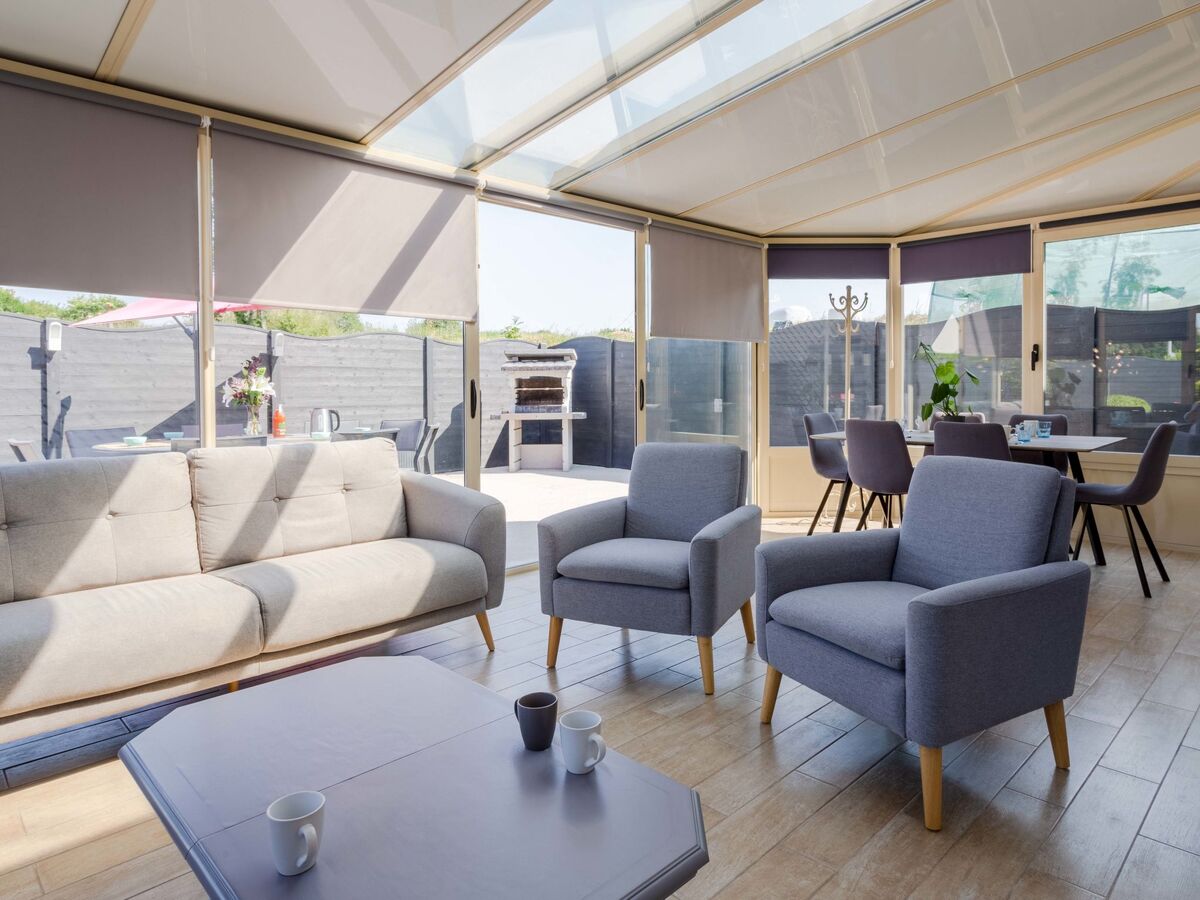 Aménagement agréable et de bon goût: séjour/salle à manger avec jardin d'hiver avec table pour les repas, TV (satellite) et chaînes de TV internationales.