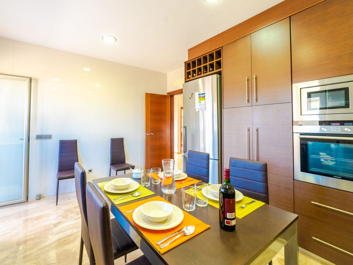 Cuisine/séjour (4 plaques de cuisson, four, lave-vaisselle, micro-ondes, congélateur, cafetière électrique) avec table pour les repas.