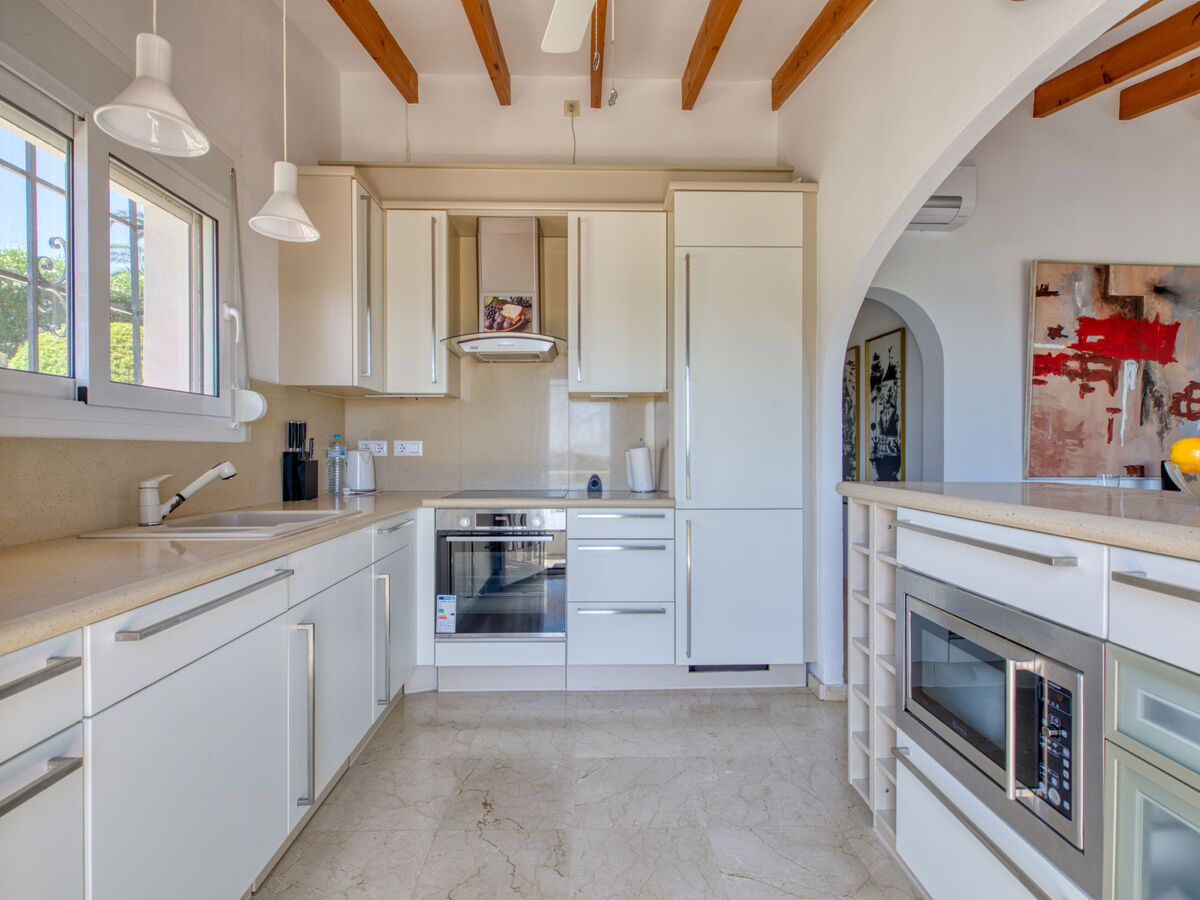 Cuisine ouverte (four, lave-vaisselle, 4 plaques vitrocéramiques, micro-ondes, congélateur, cafetière électrique).